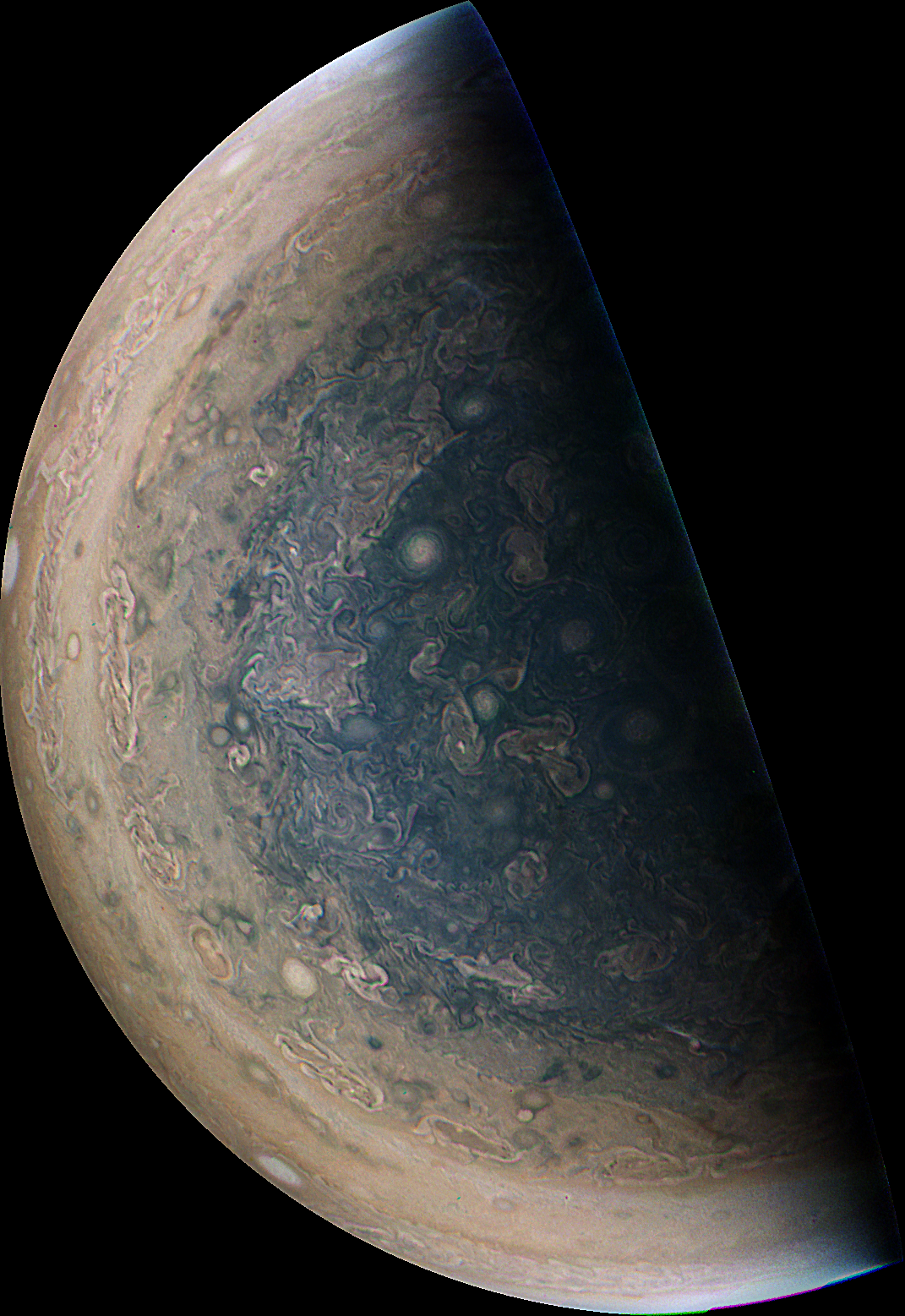 Junocam pixels are 12 bits deep from the camera but are converted to 8 bits inside the instrument using a lossless "companding" table, a process similar to gamma correction, to reduce their size. All Junocam products on the missionjuno website are in this 8-bit form as received on Earth. Scientific users interested in radiometric analysis should use the "RDR" data products archived with the Planetary Data System, which have been converted back to a linear 12-bit scale.