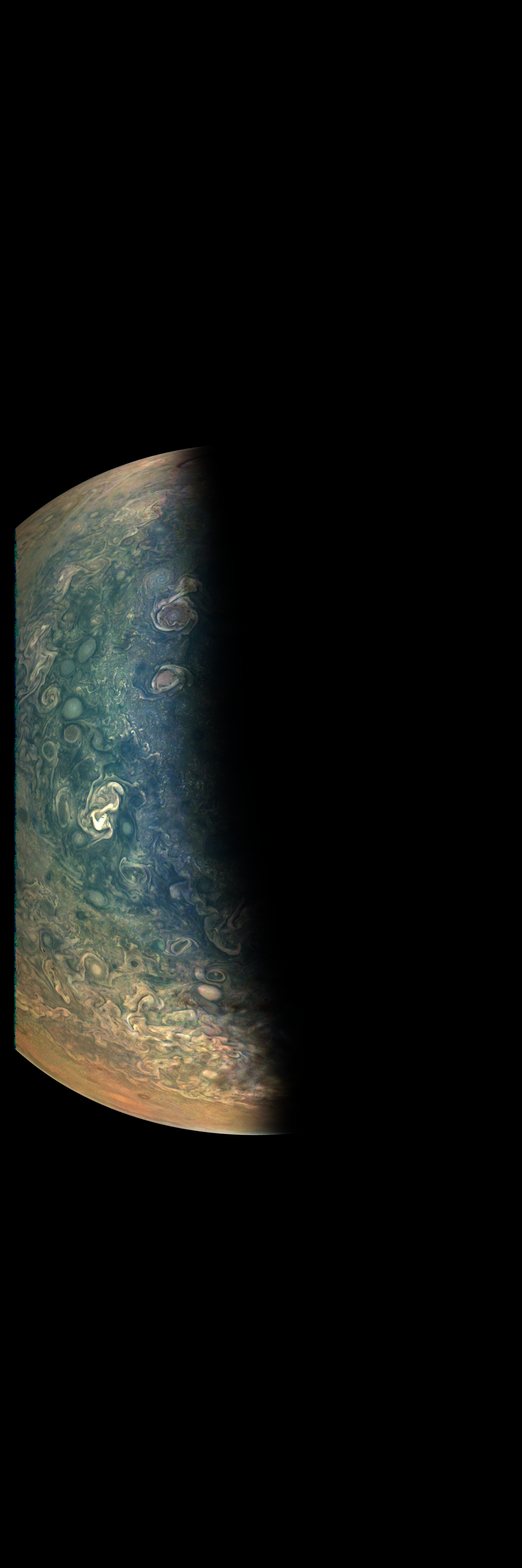 Junocam pixels are 12 bits deep from the camera but are converted to 8 bits inside the instrument using a lossless "companding" table, a process similar to gamma correction, to reduce their size. All Junocam products on the missionjuno website are in this 8-bit form as received on Earth. Scientific users interested in radiometric analysis should use the "RDR" data products archived with the Planetary Data System, which have been converted back to a linear 12-bit scale.