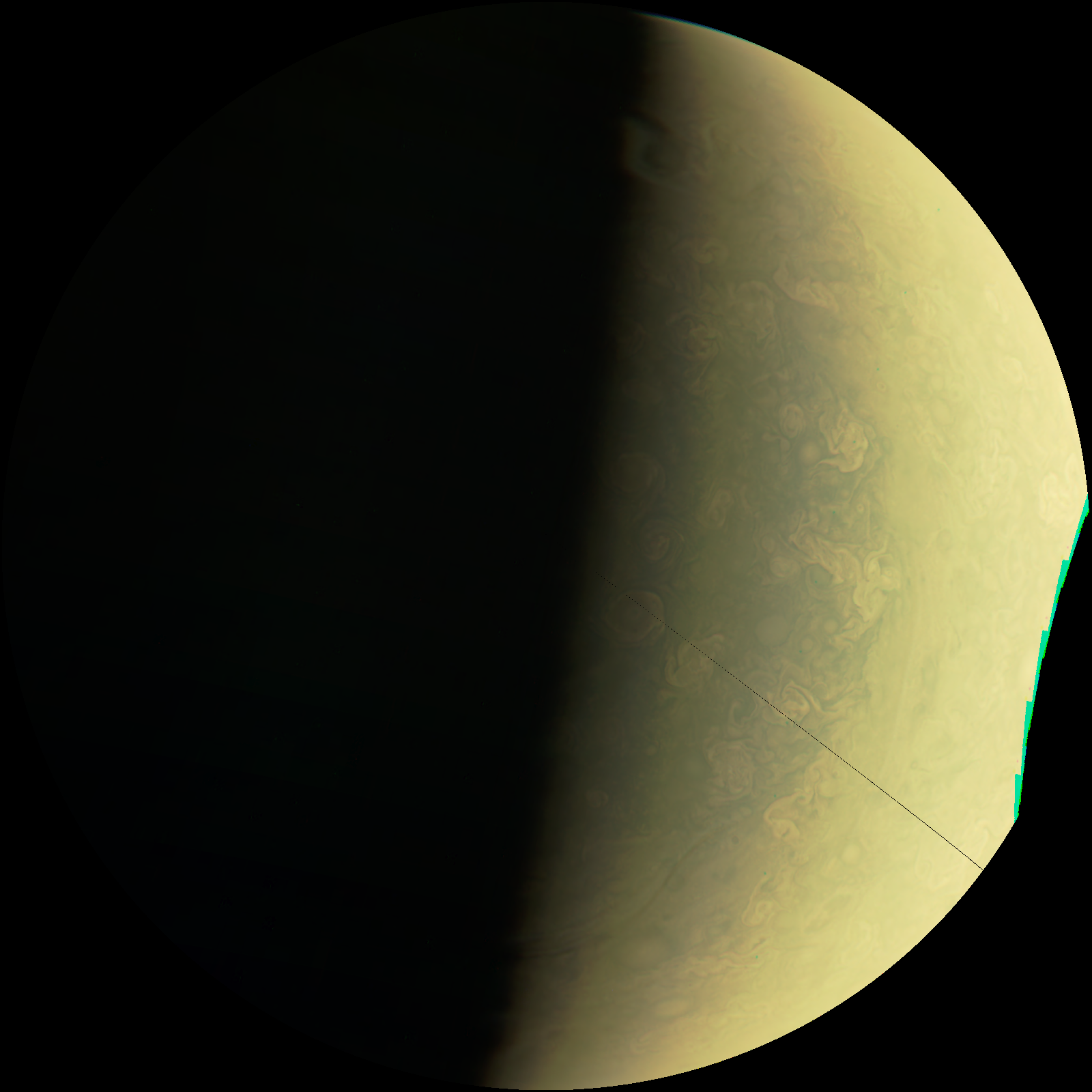 Junocam pixels are 12 bits deep from the camera but are converted to 8 bits inside the instrument using a lossless "companding" table, a process similar to gamma correction, to reduce their size. All Junocam products on the missionjuno website are in this 8-bit form as received on Earth. Scientific users interested in radiometric analysis should use the "RDR" data products archived with the Planetary Data System, which have been converted back to a linear 12-bit scale.