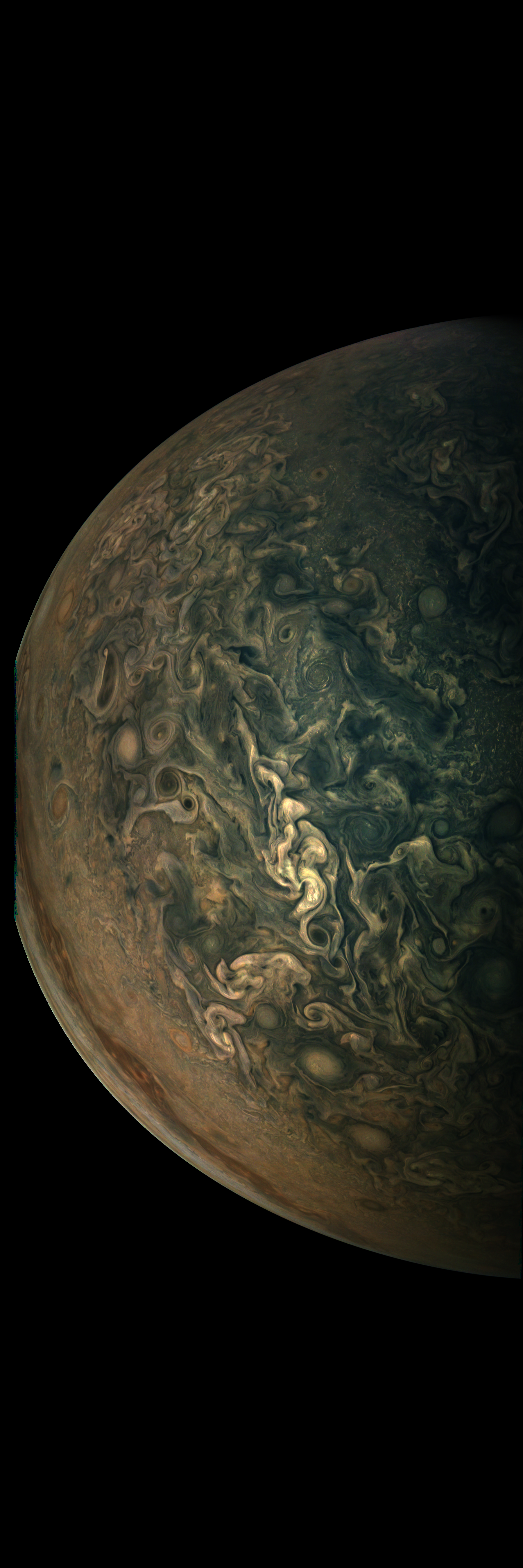 Resolution is 30 pixels per degrees in an equidistant cylindrical system centered to the camera at image stop time, with an axis parallel to Juno's spin axis. The rendered field of view is 60x180 degrees.