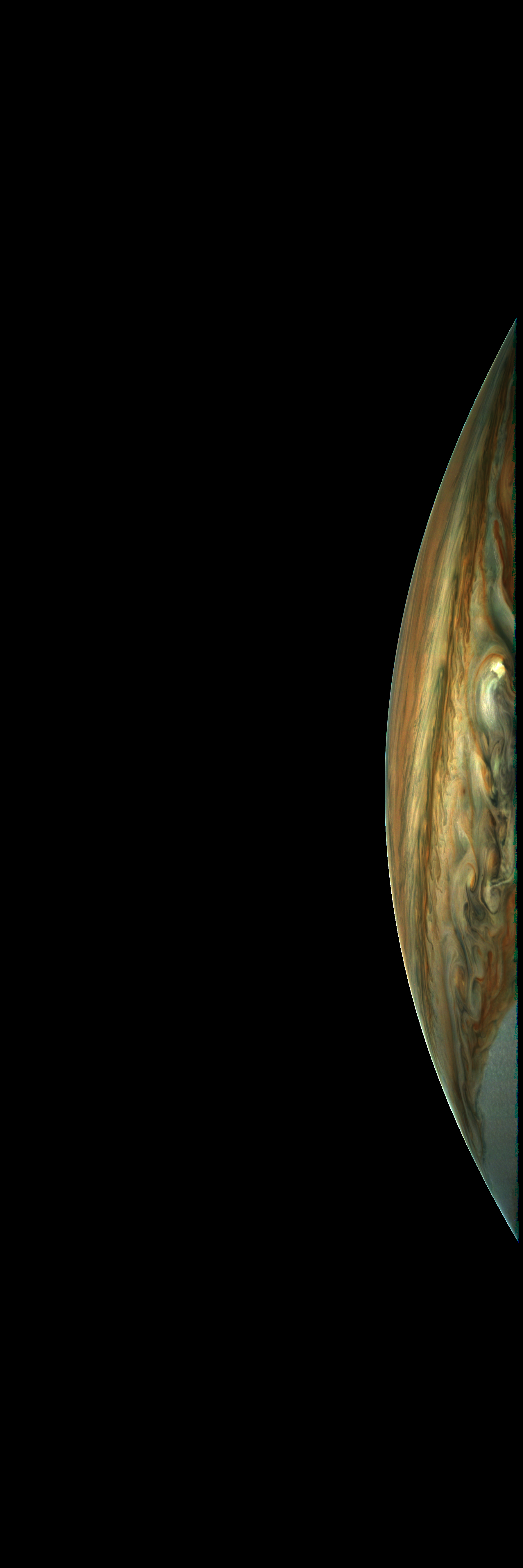 Resolution is 30 pixels per degrees in an equidistant cylindrical system centered to the camera at image stop time, with an axis parallel to Juno's spin axis. The rendered field of view is 60x180 degrees.