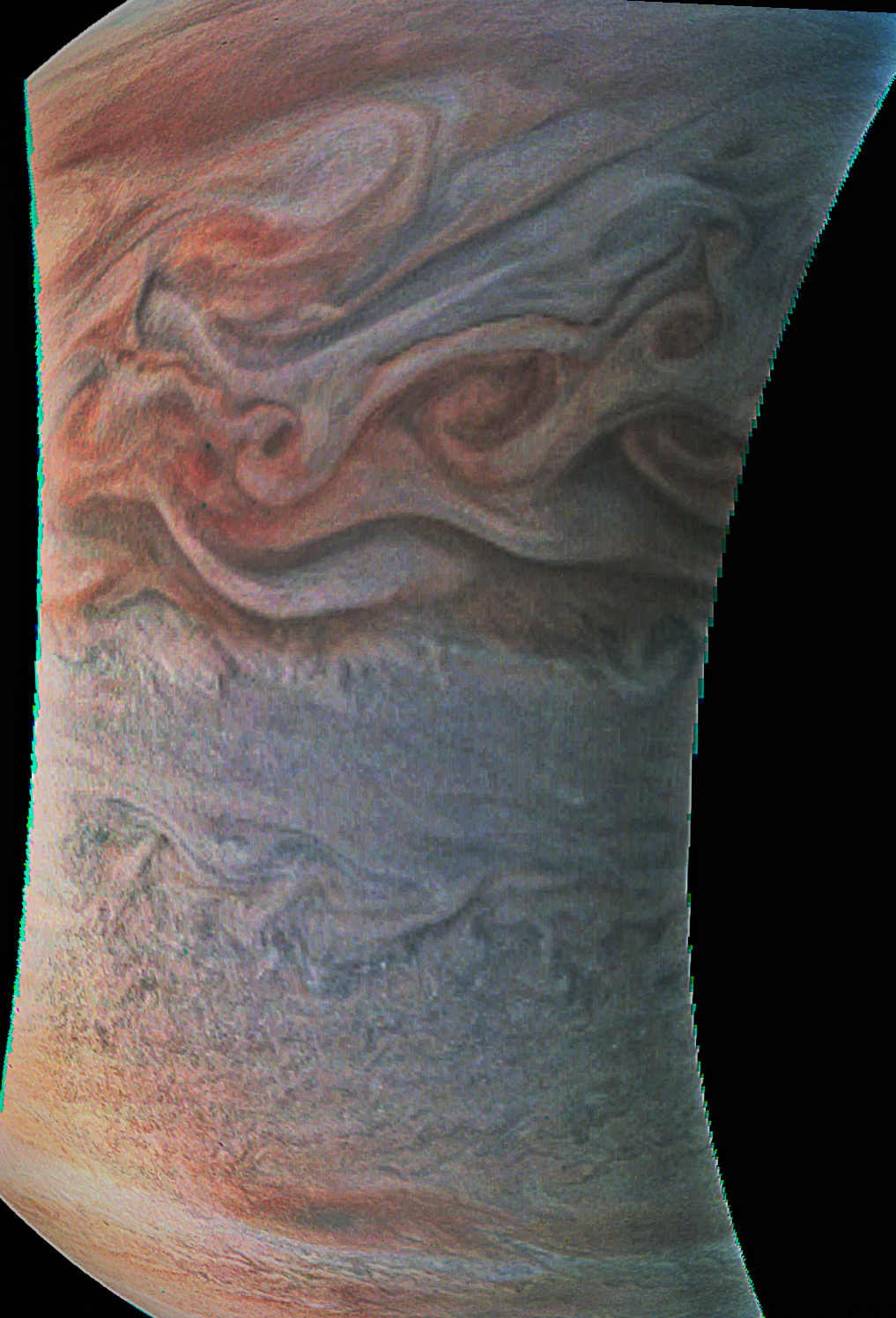 Junocam pixels are 12 bits deep from the camera but are converted to 8 bits inside the instrument using a lossless "companding" table, a process similar to gamma correction, to reduce their size. All Junocam products on the missionjuno website are in this 8-bit form as received on Earth. Scientific users interested in radiometric analysis should use the "RDR" data products archived with the Planetary Data System, which have been converted back to a linear 12-bit scale.