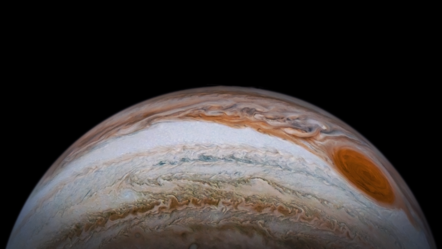 Processed using the JunoCam imager's Perijove 21 Great Red Spot raw images and data from NASA's Juno spacecraft flyby on July 21, 2019. Enhanced to highlight features, clouds, colours, and the beauty of Jupiter. Artist's impression - not representative of true colour.