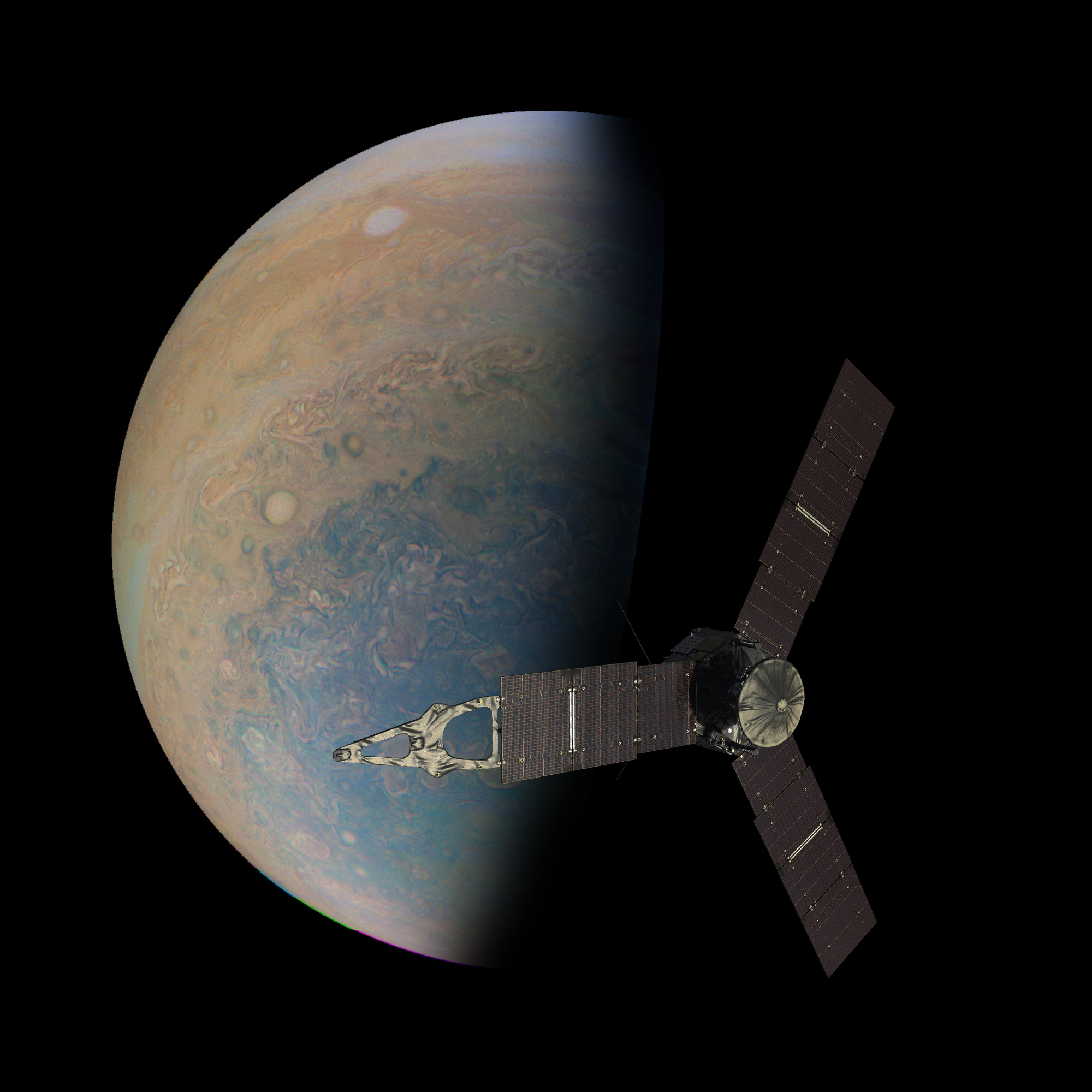 Depiction of the spacecraft Juno approaching Jupiter. Spacecraft image obtained via public domain at the source listed in credit.