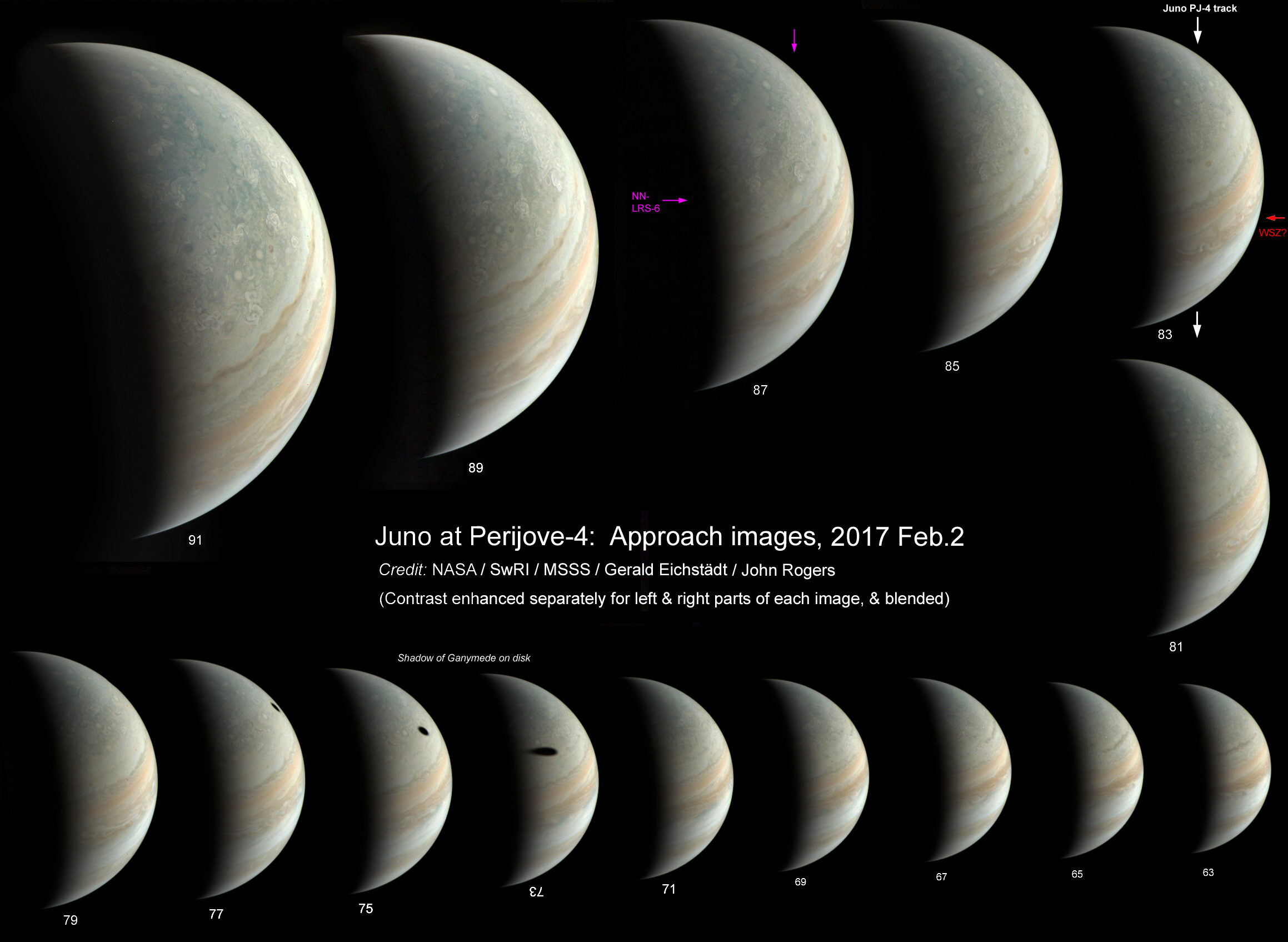 Gerald has processed the Perijove-4 approach images, and here are contrast-enhanced versions of the last 15, showing the northern hemisphere.