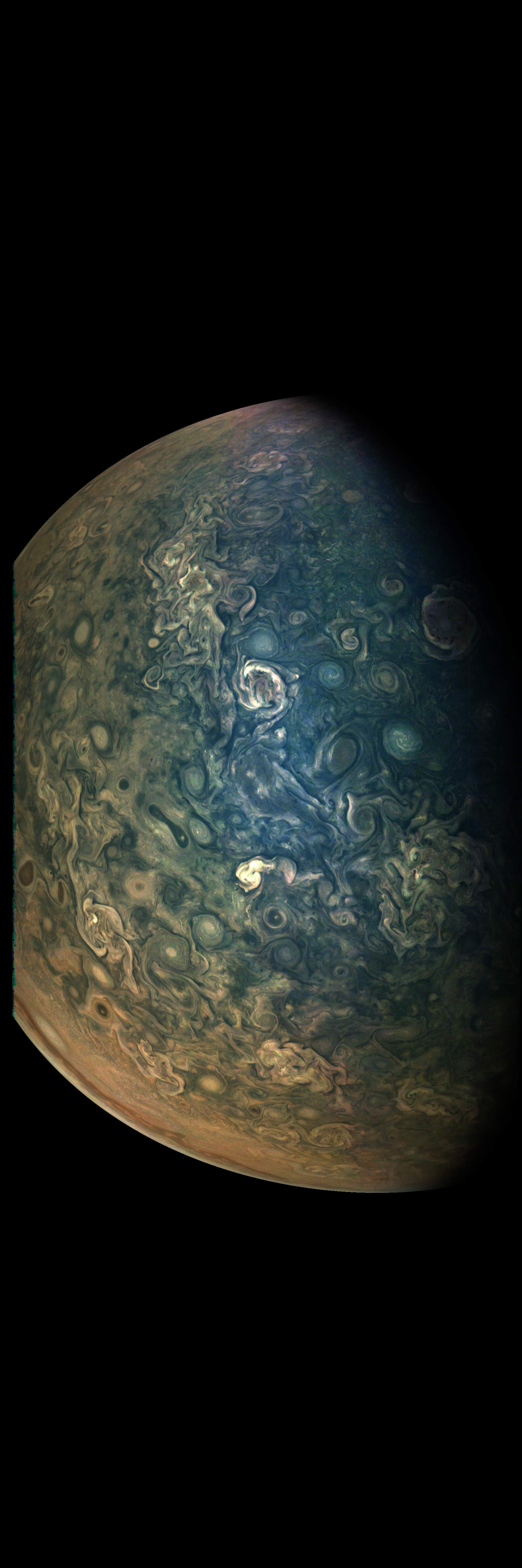 Junocam pixels are 12 bits deep from the camera but are converted to 8 bits inside the instrument using a lossless "companding" table, a process similar to gamma correction, to reduce their size. All Junocam products on the missionjuno website are in this 8-bit form as received on Earth. Scientific users interested in radiometric analysis should use the "RDR" data products archived with the Planetary Data System, which have been converted back to a linear 12-bit scale.