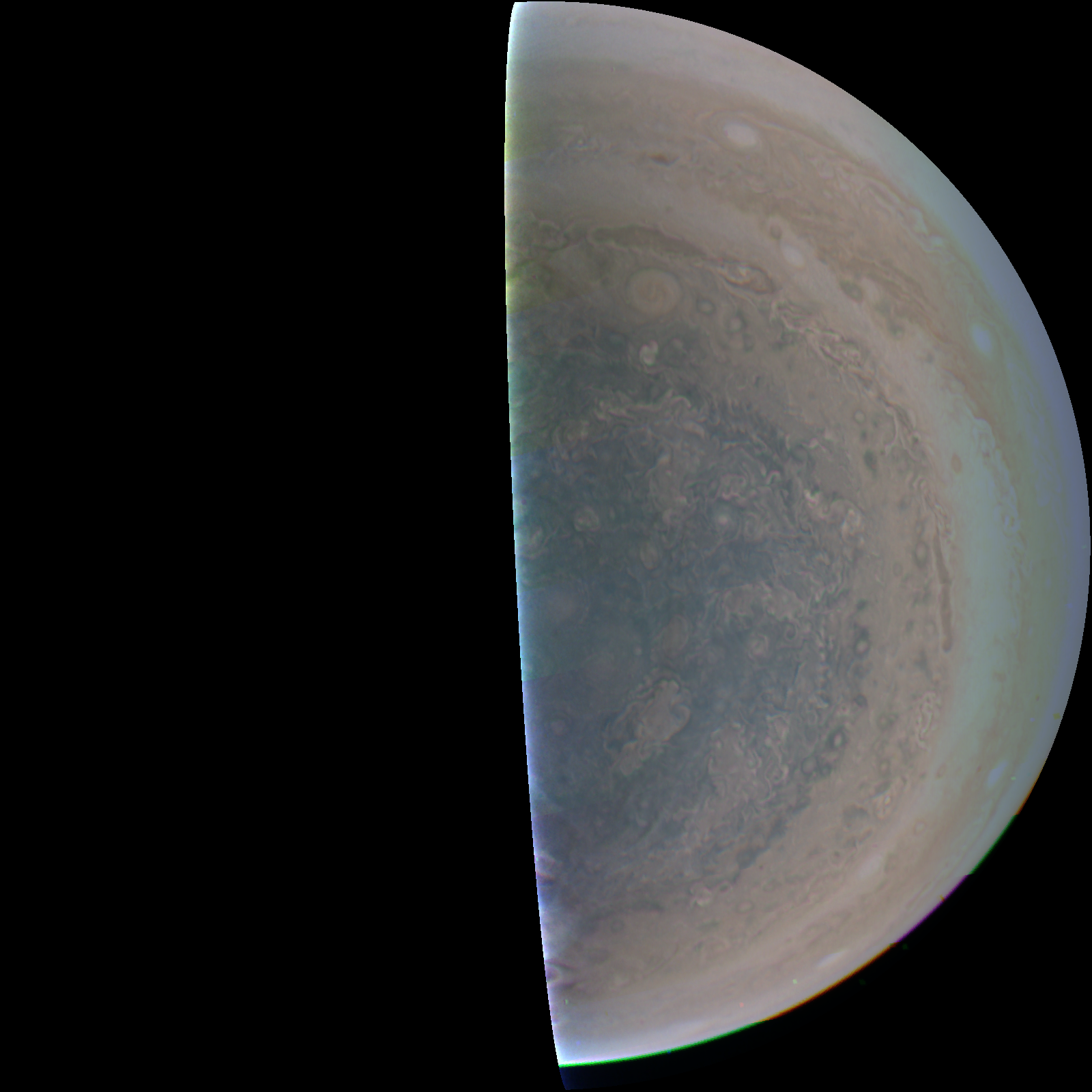 Junocam pixels are 12 bits deep from the camera but are converted to 8 bits inside the instrument using a lossless "companding" table, a process similar to gamma correction, to reduce their size. All Junocam products on the missionjuno website are in this 8-bit form as received on Earth. Scientific users interested in radiometric analysis should use the "RDR" data products archived with the Planetary Data System, which have been converted back to a linear 12-bit scale.