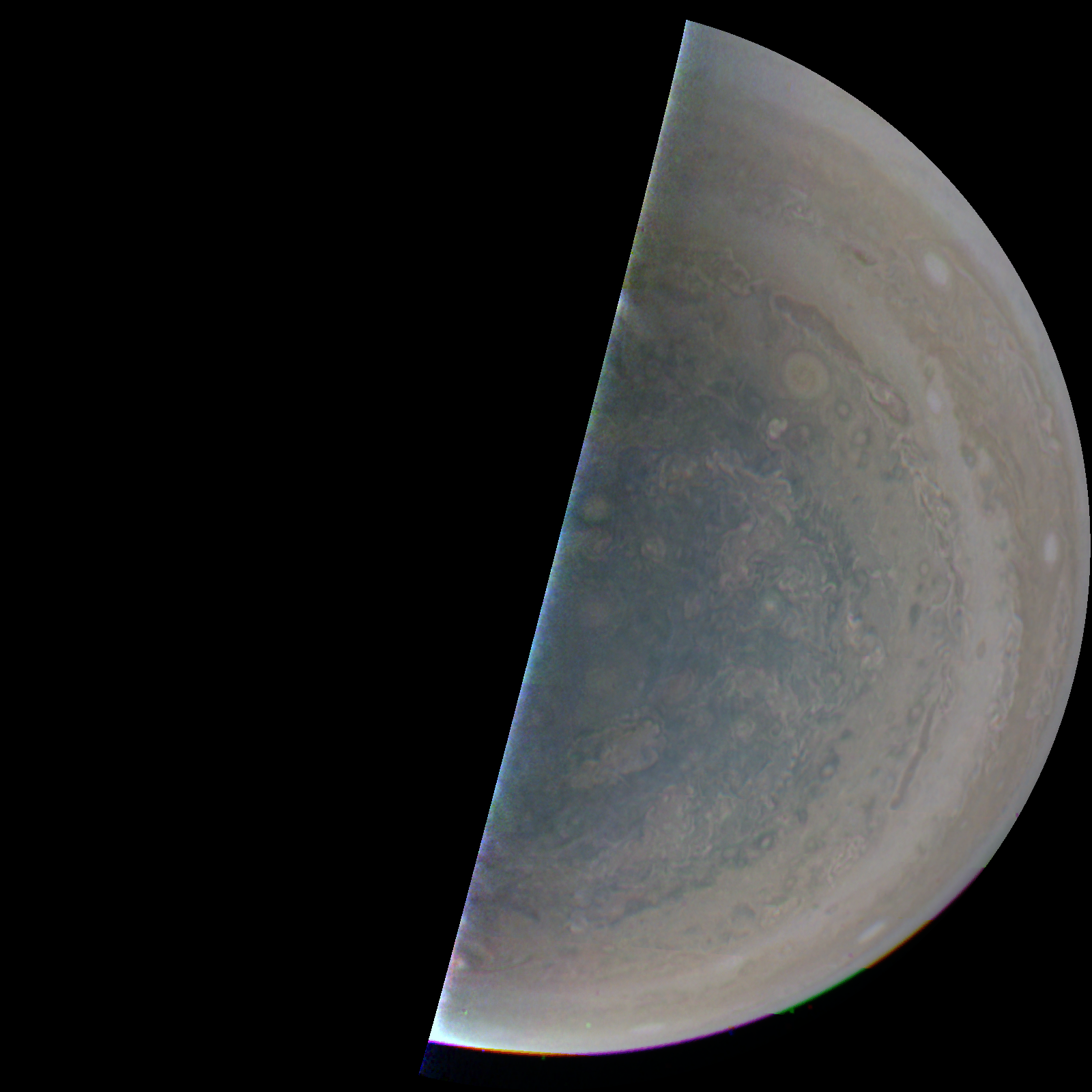 Junocam pixels are 12 bits deep from the camera but are converted to 8 bits inside the instrument using a lossless "companding" table, a process similar to gamma correction, to reduce their size. All Junocam products on the missionjuno website are in this 8-bit form as received on Earth. Scientific users interested in radiometric analysis should use the "RDR" data products archived with the Planetary Data System, which have been converted back to a linear 12-bit scale.