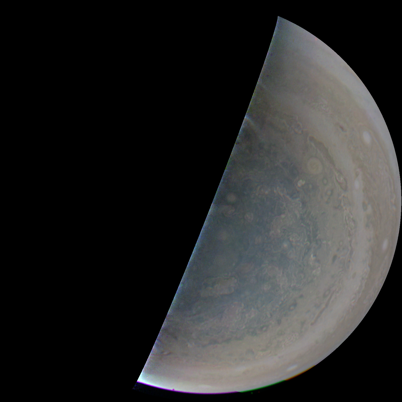 Junocam pixels are 12 bits deep from the camera but are converted to 8 bits inside the instrument using a lossless "companding" table, a process similar to gamma correction, to reduce their size. All Junocam products on the missionjuno website are in this 8-bit form as received on Earth. Scientific users interested in radiometric analysis should use the "RDR" data products archived with the Planetary Data System, which have been converted back to a linear 12-bit scale.