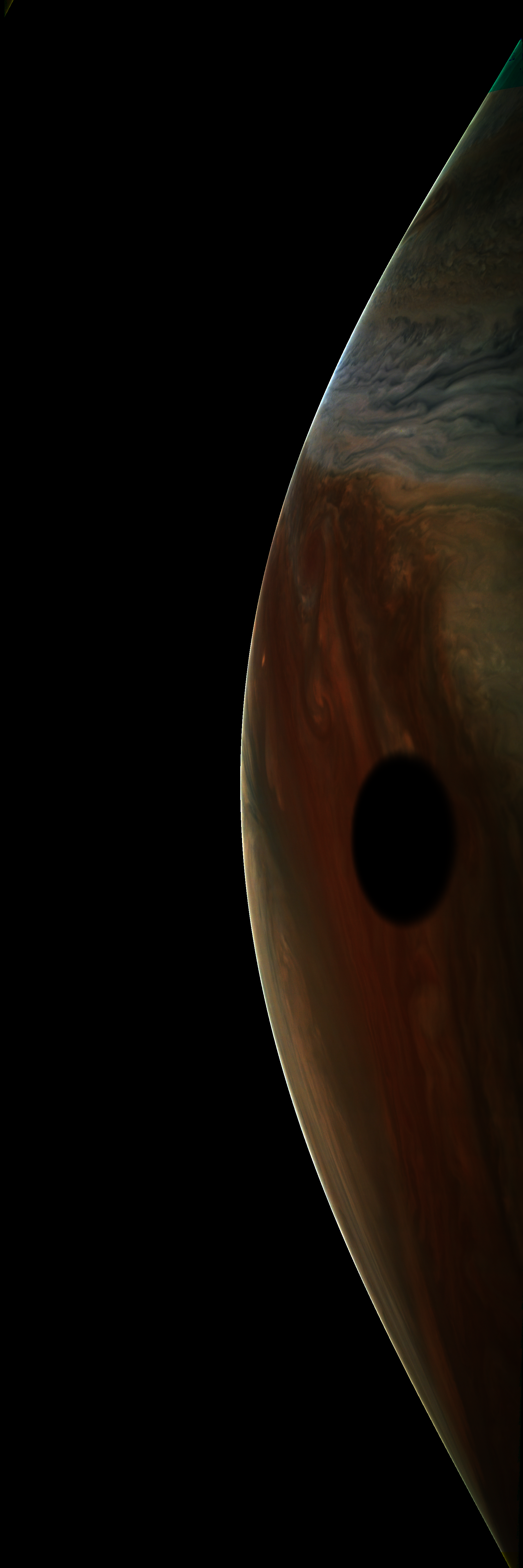 Resolution is 30 pixels per degrees in an equidistant cylindrical system centered to the camera at image stop time, with an axis parallel to Juno's spin axis. The rendered field of view is 60x180 degrees.