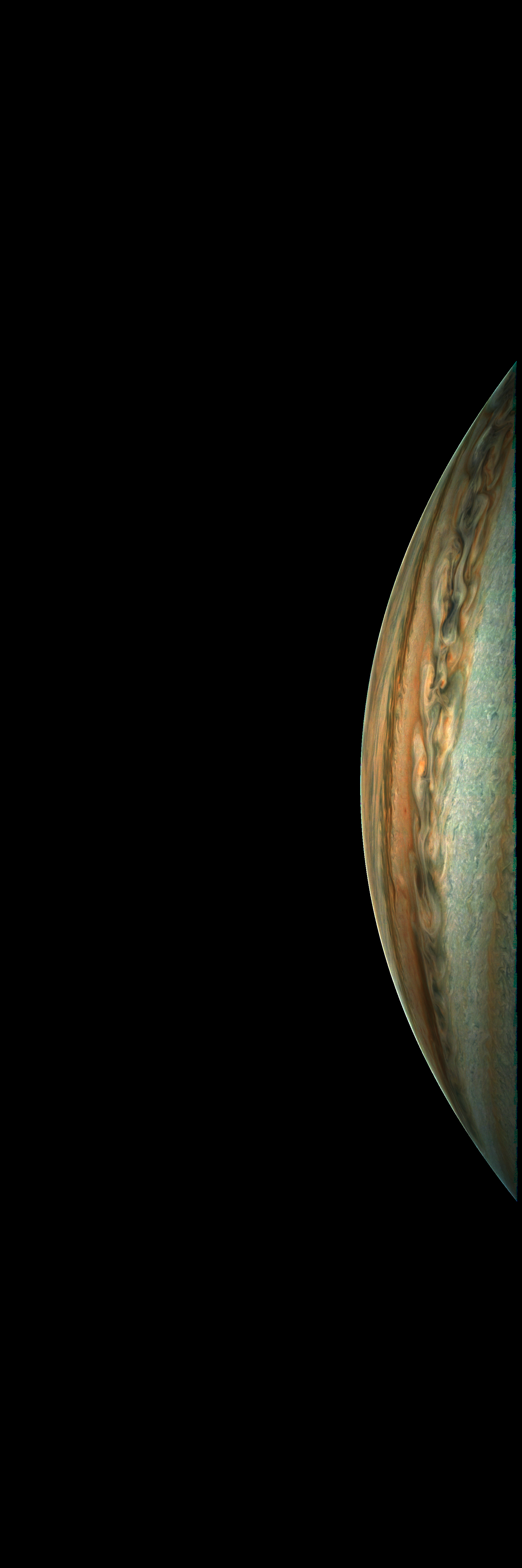 Resolution is 30 pixels per degrees in an equidistant cylindrical system centered to the camera at image stop time, with an axis parallel to Juno's spin axis. The rendered field of view is 60x180 degrees.
