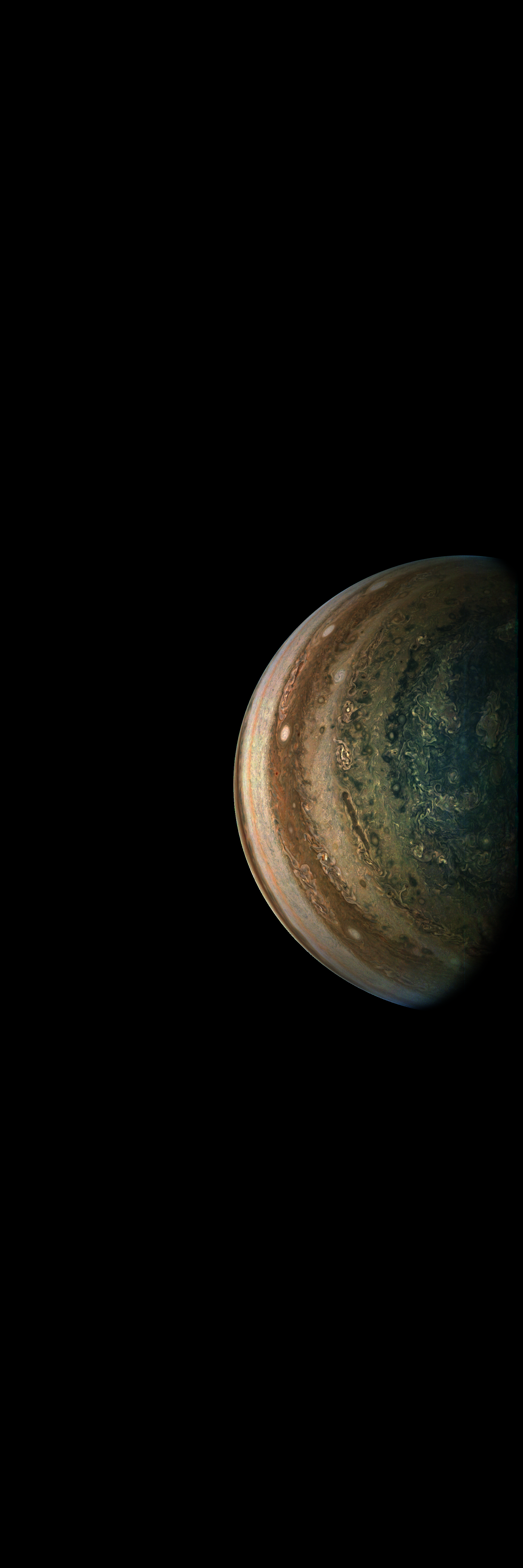Resolution is 30 pixels per degrees in an equidistant cylindrical system centered to the camera at image stop time, with an axis parallel to Juno's spin axis. The rendered field of view is 60x180 degrees.