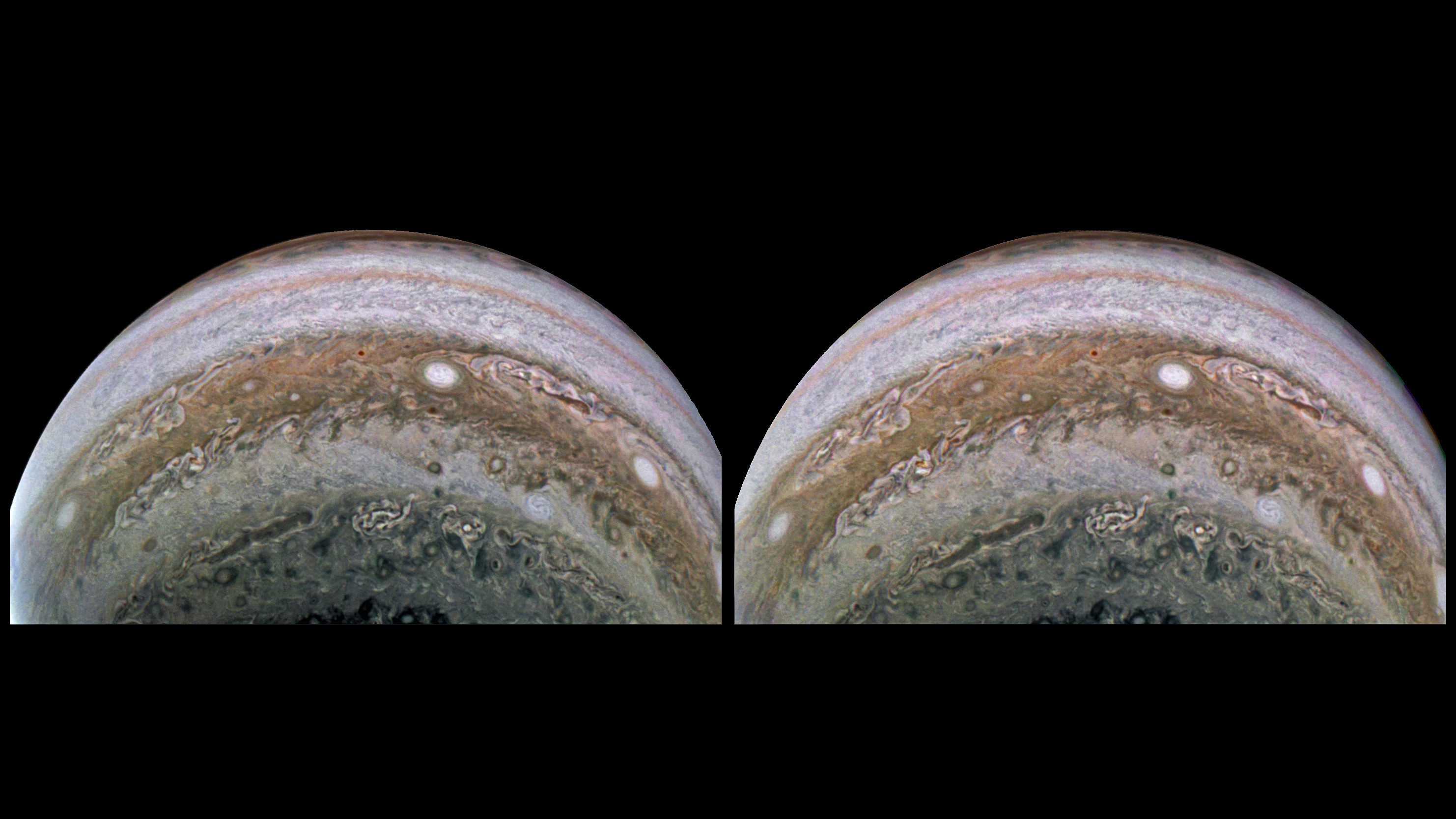 This is an actual stereograph, not an artificial 3D conversion made from a single 2D image. The 6-minute 1.0-second interval between two JunoCam images taken during the time lapse sequence of Perijove 22 (12 September 2019 at 04:37:55.259 and 04:43:56.239 UTC) established a stereo base (camera separation) of thousands of kilometers, from which this stereographic image pair was crafted using Photoshop. Thanks to the velocity of Juno, the distance traveled during the interval between these two captures effectively gives our eyes that same separation. Viewing Jupiter at a known average altitude of 85,954.05 km (53,409.3 miles), it's nevertheless possible to perceive features of the atmosphere three dimensionally. Juno's actual speed and, thus, the stereo base for this image pair from Perijove 22, is unknown (at least to the creator of this stereograph). Note that during the 6-minute 1.0-second interval, Juno ascended 10,283.3 km (6,389.7 miles), from 80,812.4 km to 91,095.7 km (a 12.72% gain in altitude), requiring z-axis correction in addition to x- and y-axis skewing, to produce the stereograph.