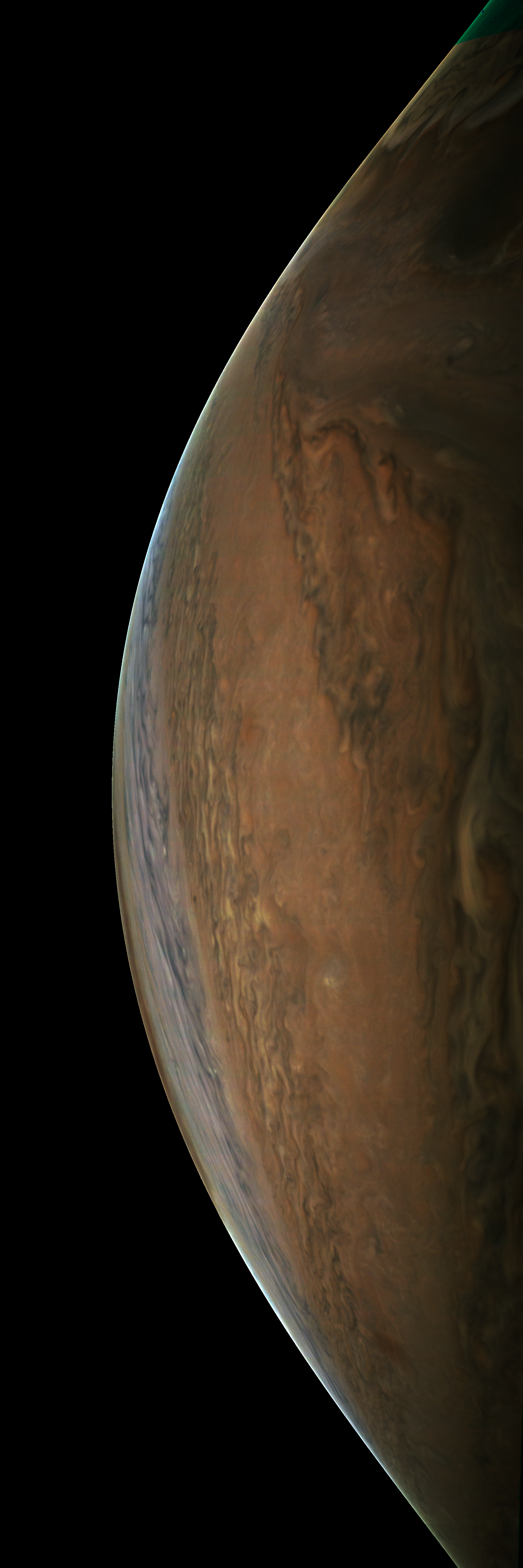 Resolution is 30 pixels per degrees in an equidistant cylindrical system centered to the camera at image stop time, with an axis parallel to Juno's spin axis. The rendered field of view is 60x180 degrees.