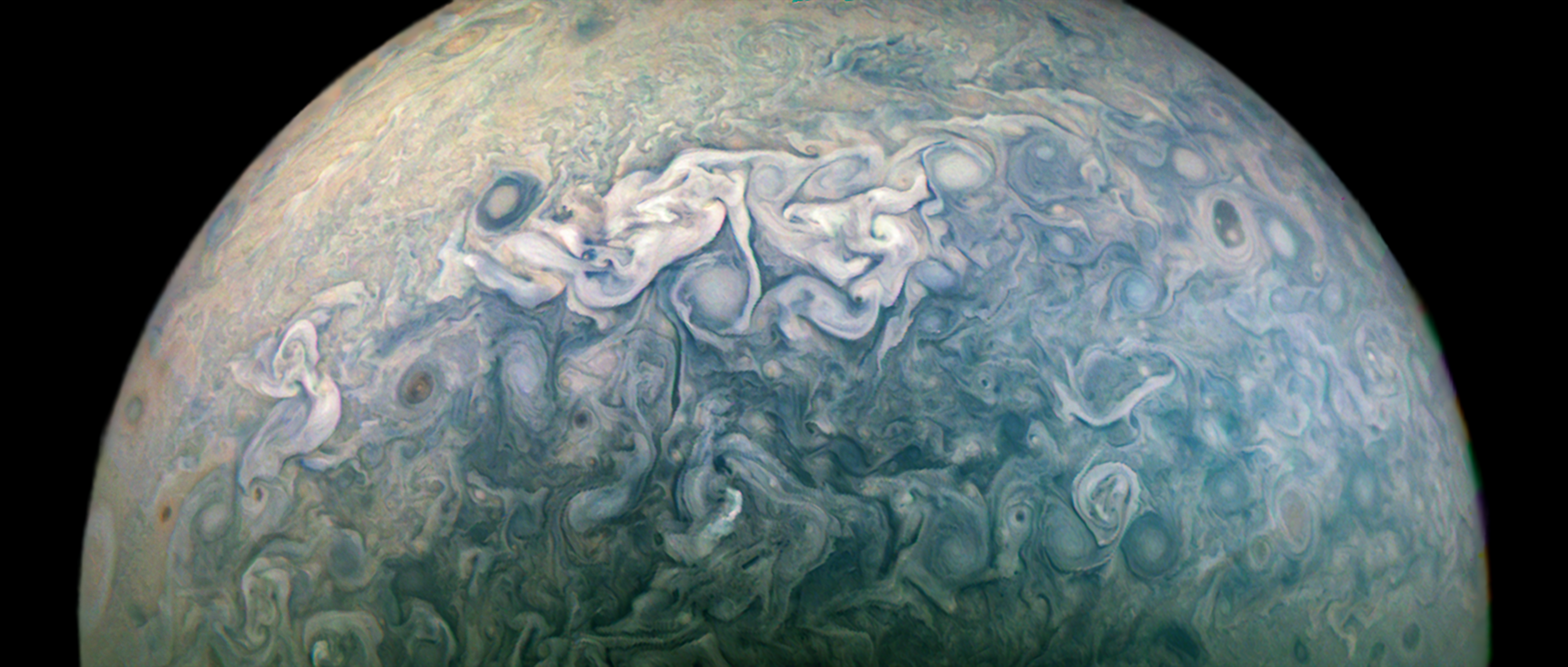 Junocam pixels are 12 bits deep from the camera but are converted to 8 bits inside the instrument using a lossless "companding" table, a process similar to gamma correction, to reduce their size. All Junocam products on the missionjuno website are in this 8-bit form as received on Earth. Scientific users interested in radiometric analysis should use the "RDR" data products archived with the Planetary Data System, which have been converted back to a linear 12-bit scale.