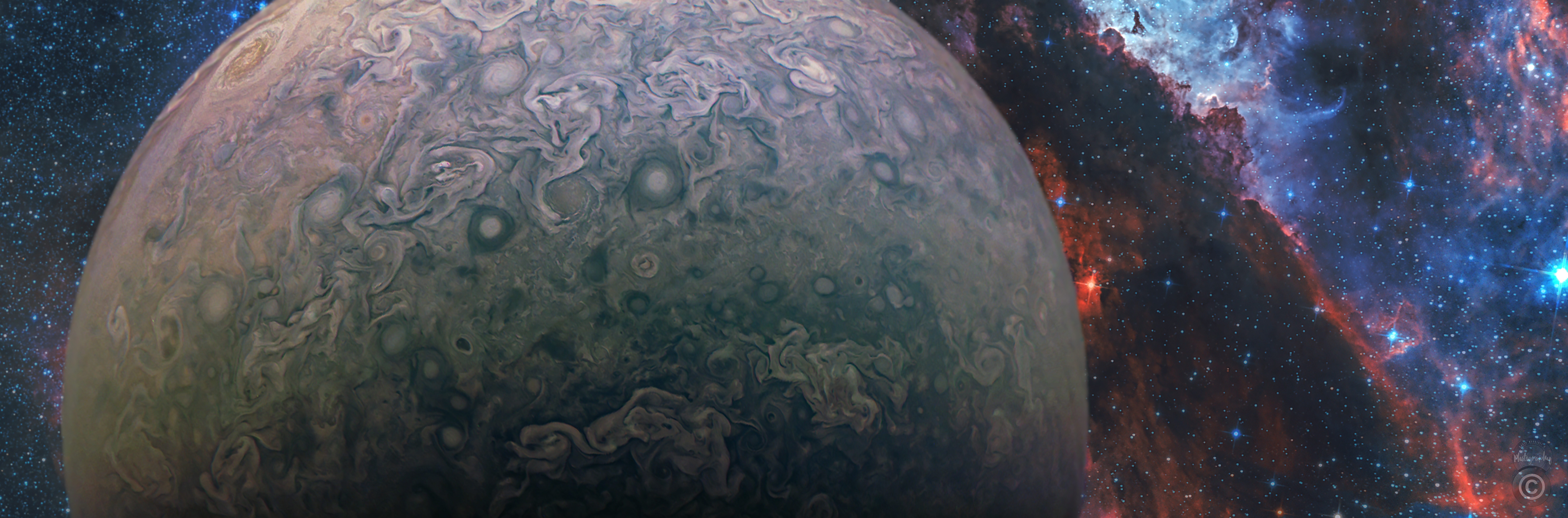 Jupiter PJ24 Folded Filamentary Region with part of the Carina Nebula in the background for an artistic touch (Carina imaging credit David Marriott)