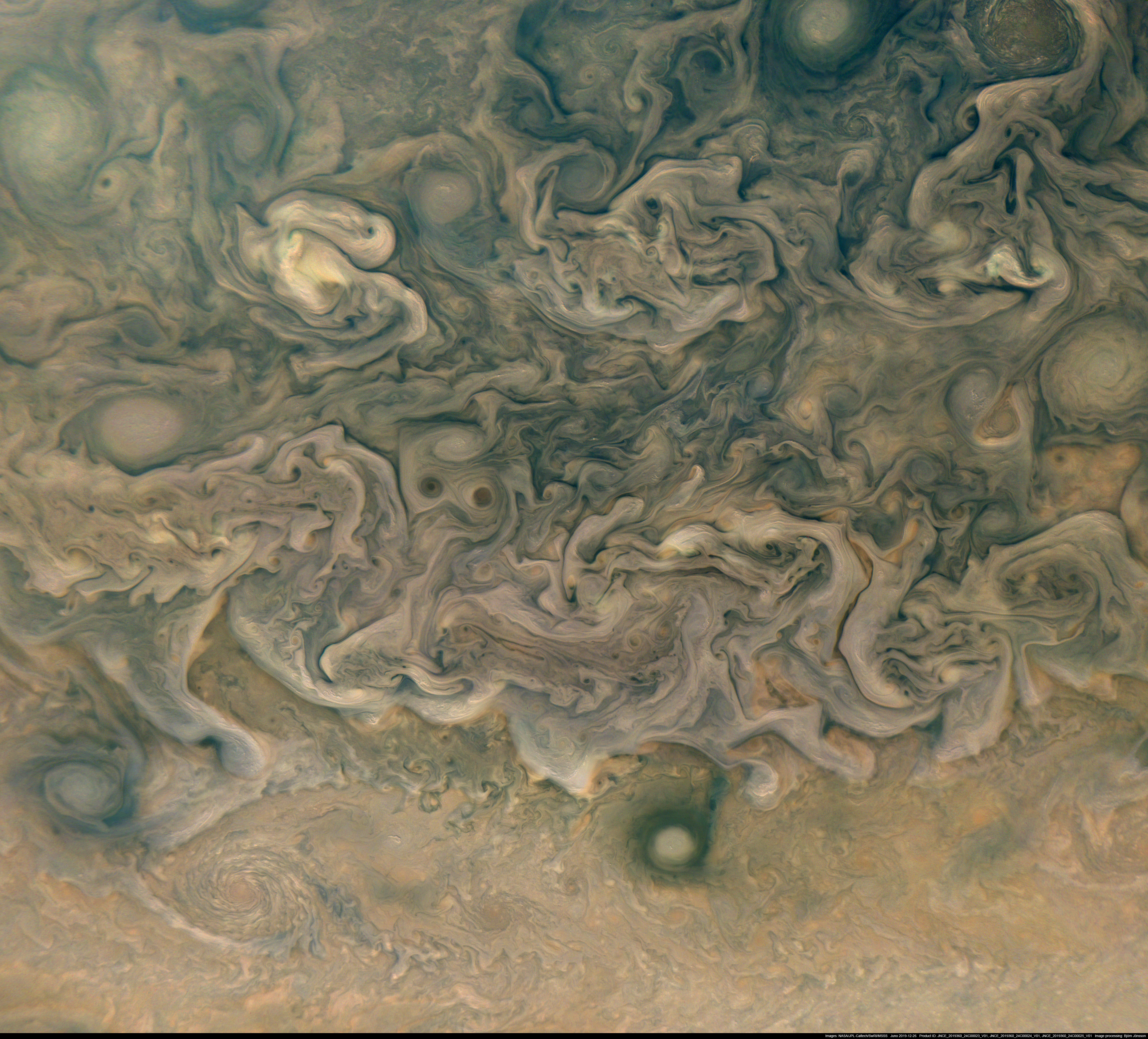 An enhanced mosaic processed from PJ24 images 23, 24 and 25. This is an orthograpic view centered on planetographic latitude 53 degrees north. Closer to the equator the cloud structure is more regular and characterized by east-west cloud belts but here it has broken up into a convoluted mess. There are lots of light and dark clouds, folded filamentary clouds, ovals of various sizes and colors and very bright pastel colored clouds. North is up.