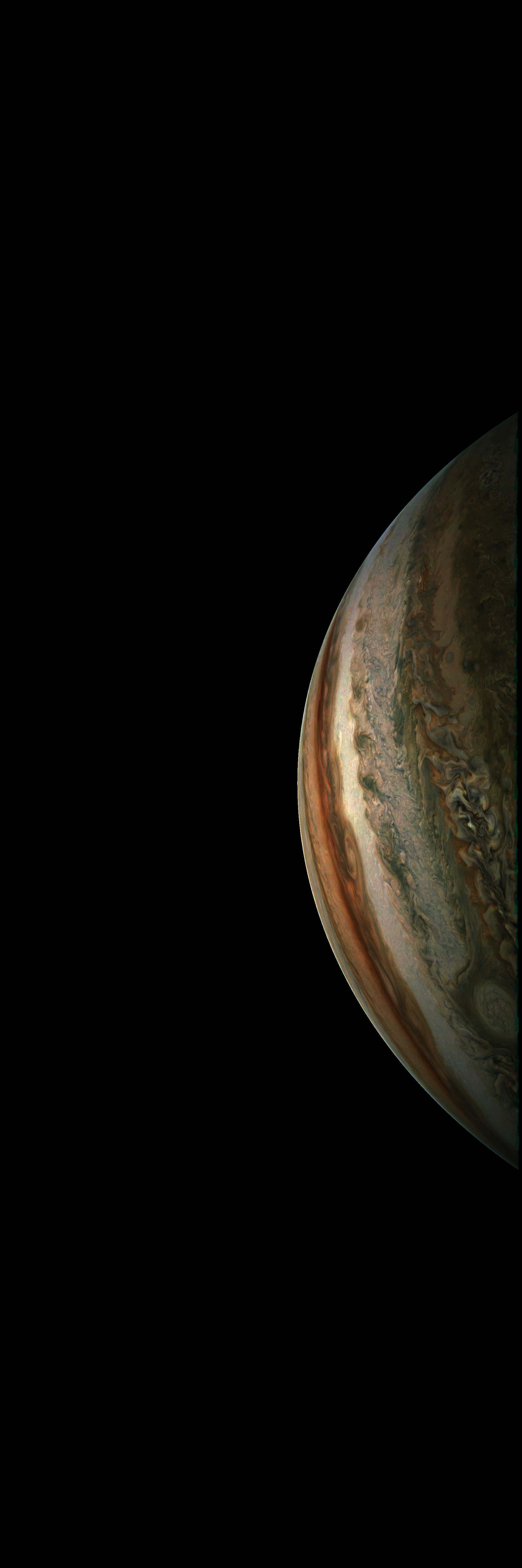 Resolution is 30 pixels per degrees in an equidistant cylindrical system centered to the camera at image stop time, with an axis parallel to Juno's spin axis. The rendered field of view is 60x180 degrees.