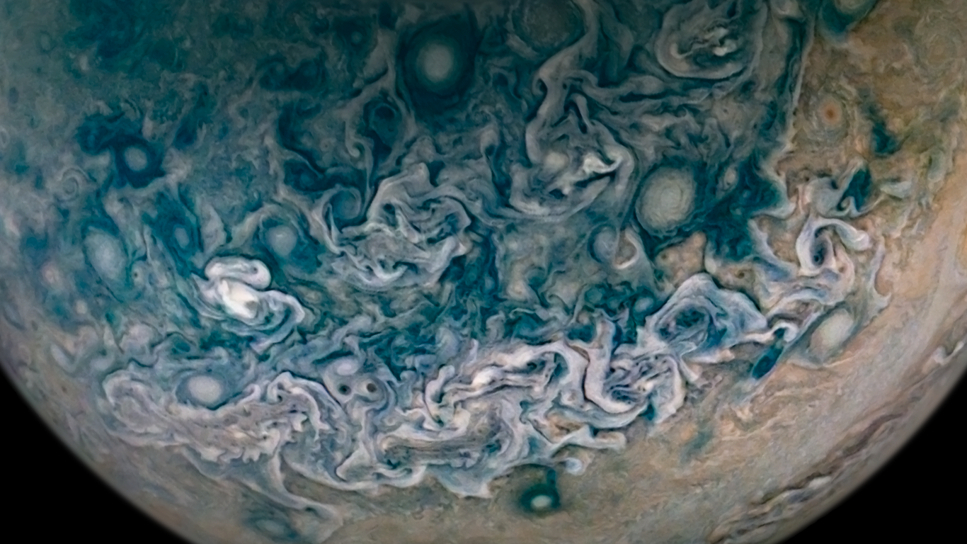 Processed using the JunoCam imager's PJ24 JET N6 raw images and data from NASA's Juno spacecraft flyby on December 26, 2019. Enhanced to highlight features, clouds, colours, and the beauty of Jupiter. Artist's impression - not representative of true colour.