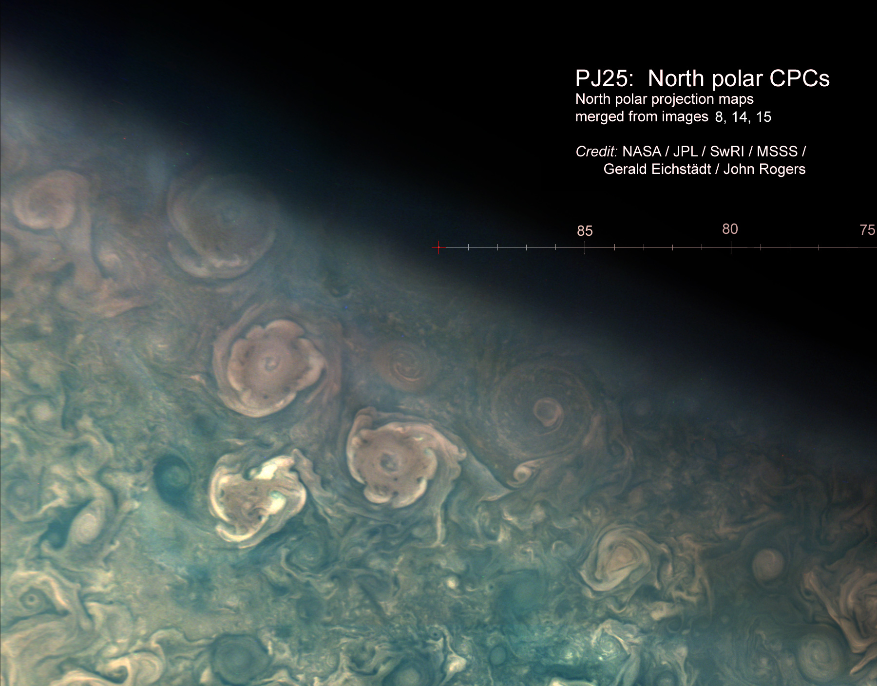 This is a composite north polar projection map derived from PJ25 images 8 & 14 & 15. Gerald Eichstädt made the individual maps, and I have merged them and enhanced the terminator region. The red cross is the north pole. Four of the circumpolar cyclones (CPCs) are nicely shown; closer to the pole there is an anticyclonic reddish oval; and traces of the central North Polar Cyclone can be seen around the pole itself, although not as regularly as at PJ24. –John Rogers.