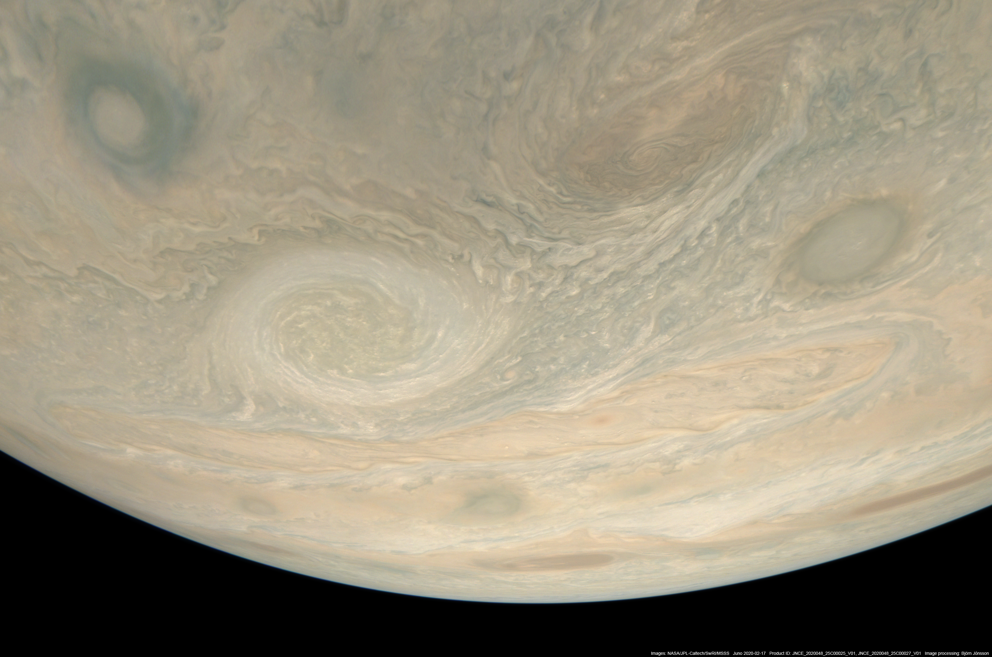 An approximately true color/contrast mosaic processed from PJ25 images 25 and 27. The mosaic shows Jupiter as seen from Juno at the time when image PJ25_27 was obtained but data from image PJ25_25 was added to show a bigger area to the north. This is a very wide angle mosaic that has a field of view of 94 degrees. Most of the mosaic comes from image 27 but roughly the uppermost quarter is from image 25. The conspicuous anticyclonic oval left of center is known as NN-WS-4. It is about 7000 km across and is at planetographic latitude 41.5 degrees north. North is up.