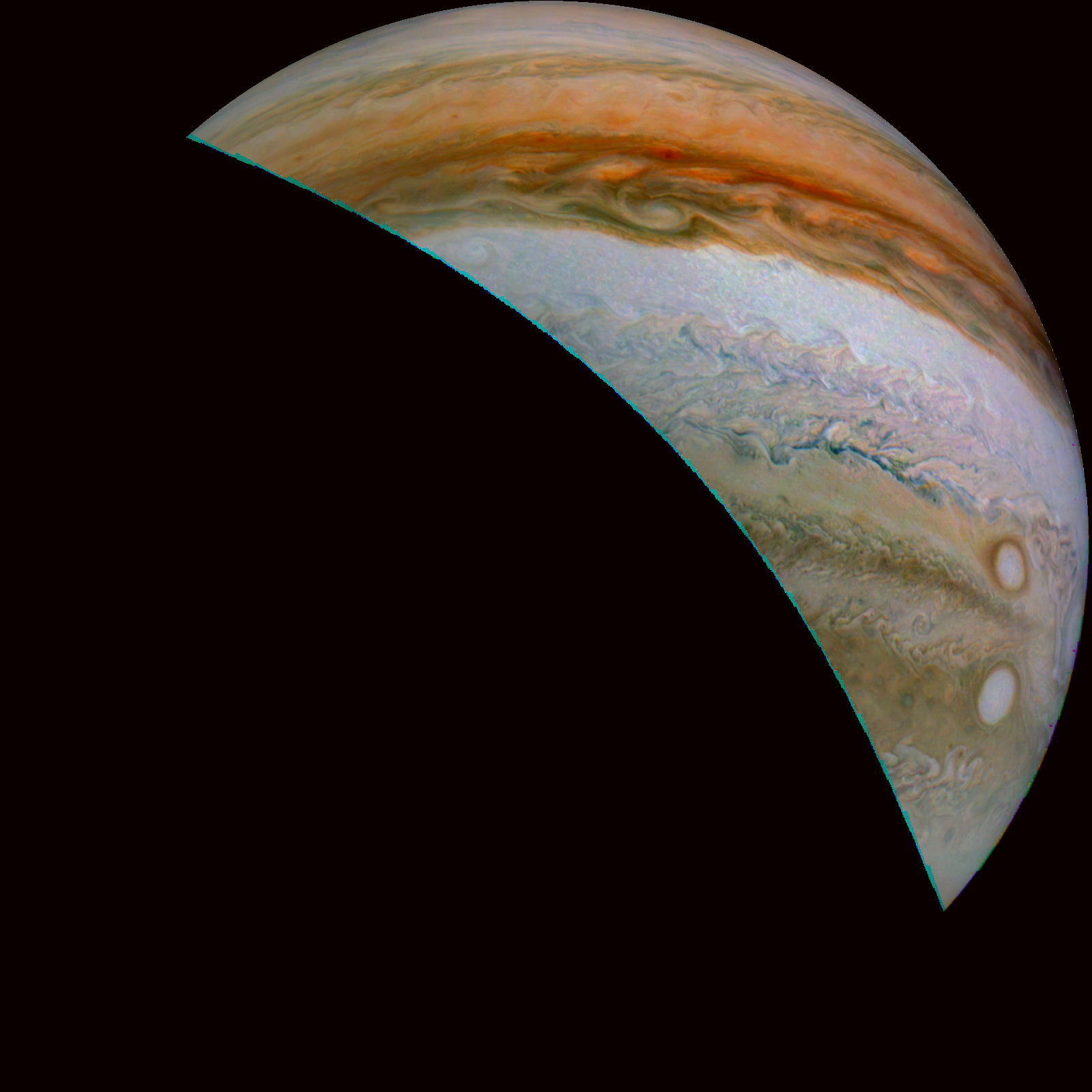 Junocam pixels are 12 bits deep from the camera but are converted to 8 bits inside the instrument using a lossless "companding" table, a process similar to gamma correction, to reduce their size. All Junocam products on the missionjuno website are in this 8-bit form as received on Earth. Scientific users interested in radiometric analysis should use the "RDR" data products archived with the Planetary Data System, which have been converted back to a linear 12-bit scale.