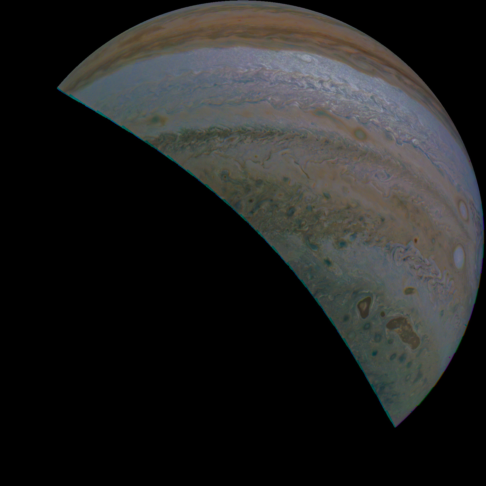 Junocam pixels are 12 bits deep from the camera but are converted to 8 bits inside the instrument using a lossless "companding" table, a process similar to gamma correction, to reduce their size. All Junocam products on the missionjuno website are in this 8-bit form as received on Earth. Scientific users interested in radiometric analysis should use the "RDR" data products archived with the Planetary Data System, which have been converted back to a linear 12-bit scale.