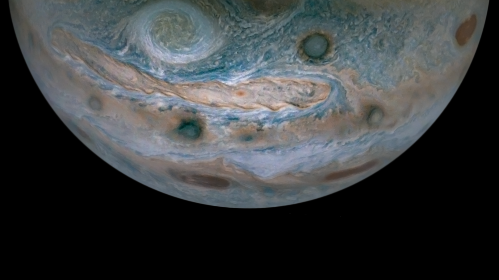 Processed using the JunoCam imager's PJ25 JET N4 raw images and data from NASA's Juno spacecraft flyby on February 17, 2020. Enhanced to highlight features, clouds, colours, and the beauty of Jupiter. Artist's impression - not representative of true colour.