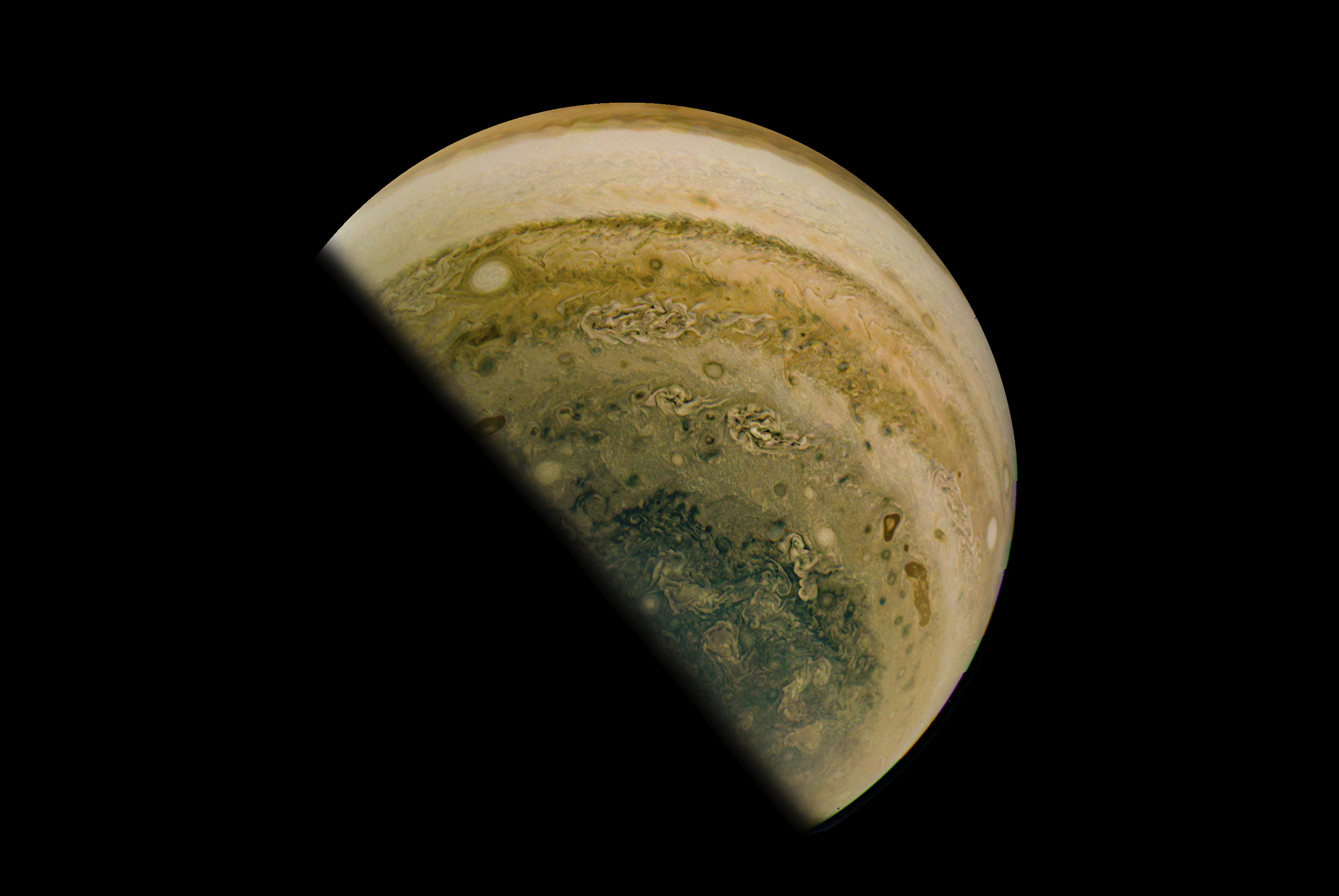Junocam pixels are 12 bits deep from the camera but are converted to 8 bits inside the instrument using a lossless "companding" table, a process similar to gamma correction, to reduce their size. All Junocam products on the missionjuno website are in this 8-bit form as received on Earth. Scientific users interested in radiometric analysis should use the "RDR" data products archived with the Planetary Data System, which have been converted back to a linear 12-bit scale.