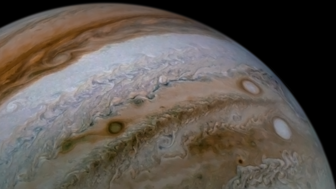 Processed using the JunoCam imager's PJ25 JET S3 – Partial raw images and data from NASA's Juno spacecraft flyby on February 17, 2020. Enhanced to highlight features, clouds, colours, and the beauty of Jupiter. Artist's impression - not representative of true colour.