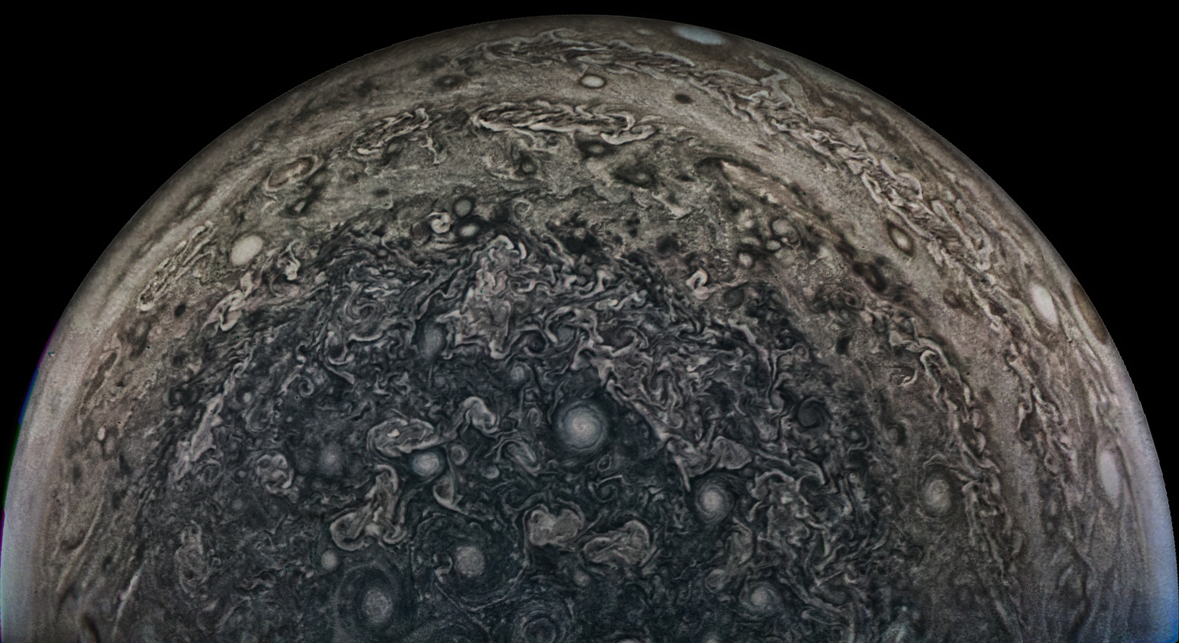 Junocam pixels are 12 bits deep from the camera but are converted to 8 bits inside the instrument using a lossless "companding" table, a process similar to gamma correction, to reduce their size. All Junocam products on the missionjuno website are in this 8-bit form as received on Earth. Scientific users interested in radiometric analysis should use the "RDR" data products archived with the Planetary Data System, which have been converted back to a linear 12-bit scale.