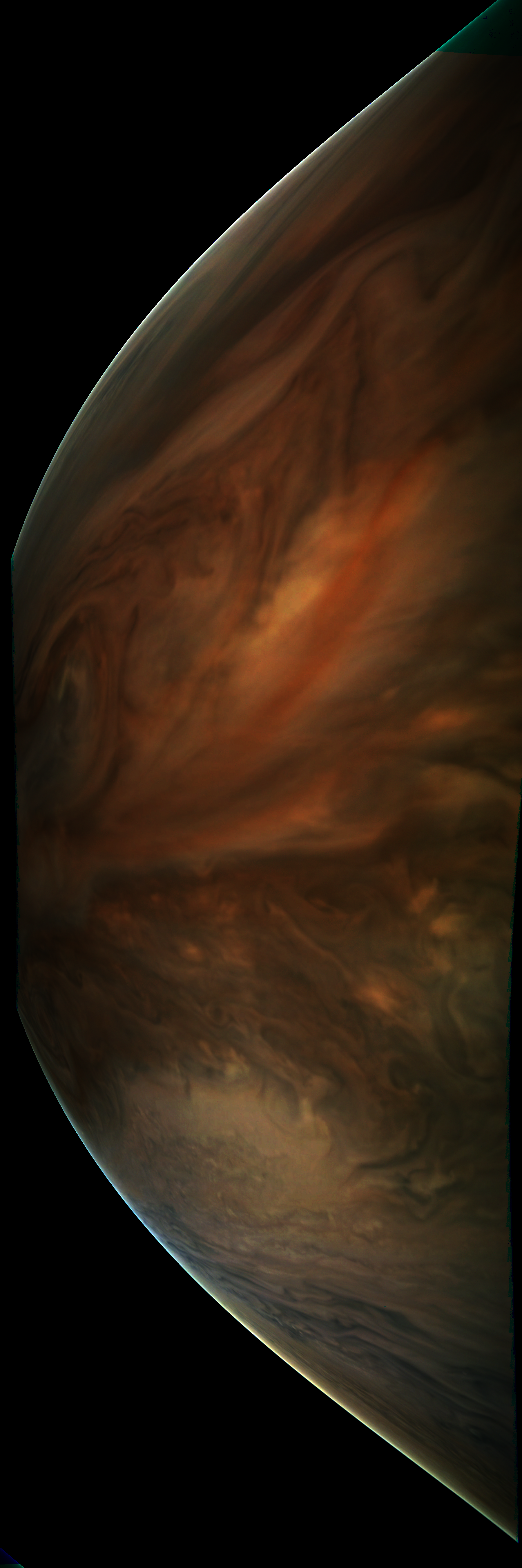 Resolution is 30 pixels per degrees in an equidistant cylindrical system centered to the camera at image stop time, with an axis parallel to Juno's spin axis. The rendered field of view is 60x180 degrees.