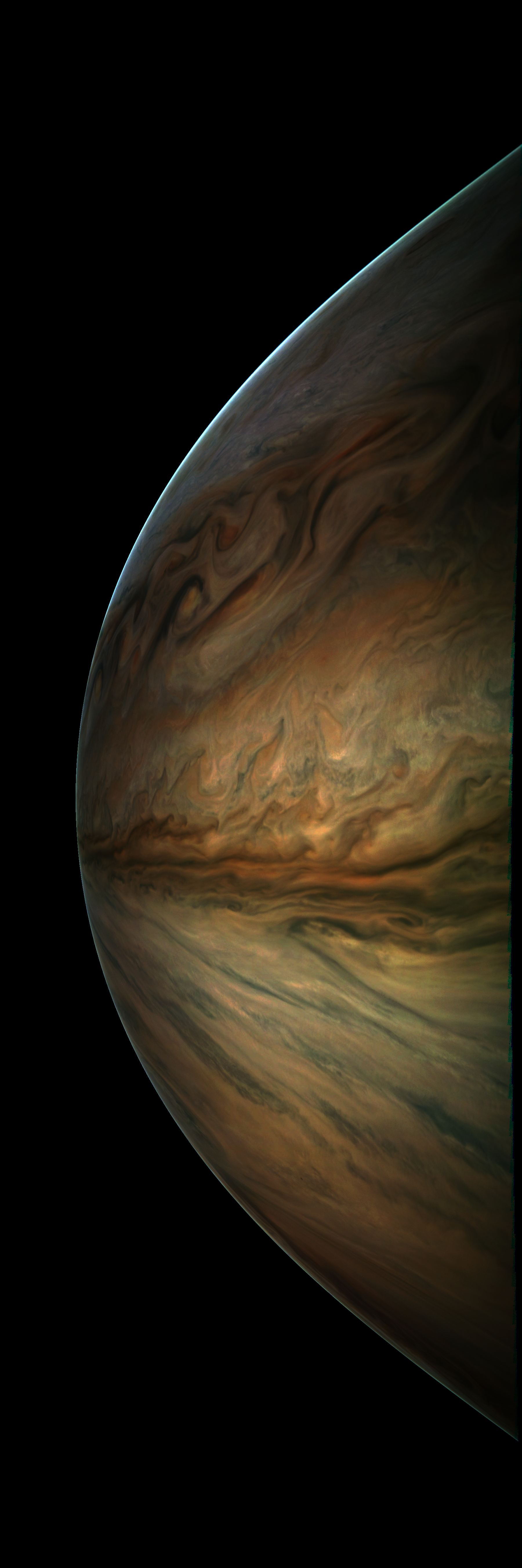 Resolution is 30 pixels per degrees in an equidistant cylindrical system centered to the camera at image stop time, with an axis parallel to Juno's spin axis. The rendered field of view is 60x180 degrees.