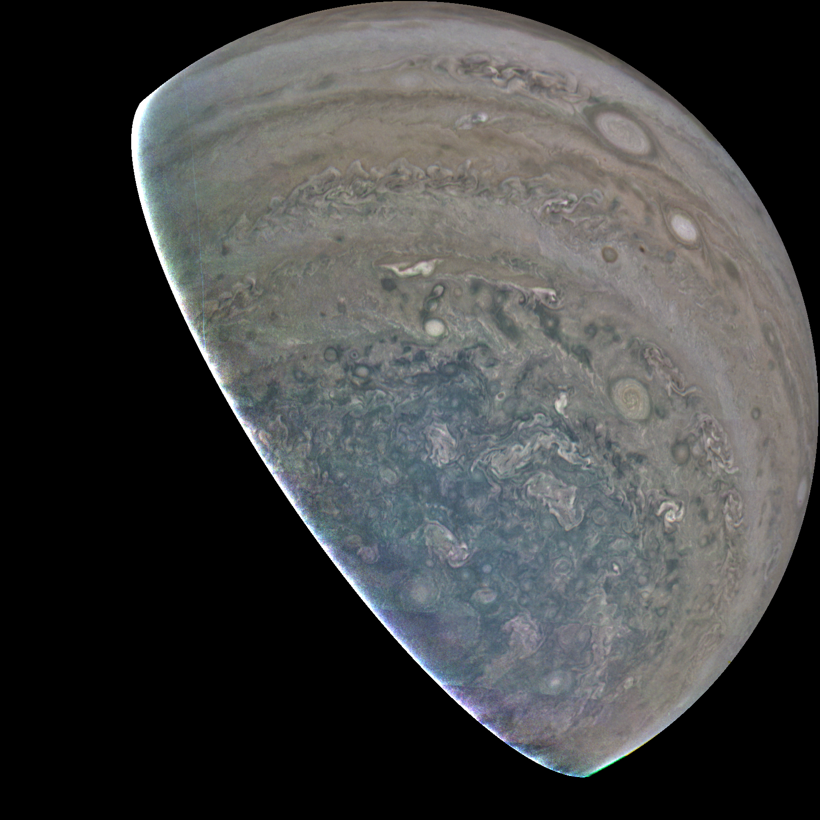 Junocam pixels are 12 bits deep from the camera but are converted to 8 bits inside the instrument using a lossless "companding" table, a process similar to gamma correction, to reduce their size. All Junocam products on the missionjuno website are in this 8-bit form as received on Earth. Scientific users interested in radiometric analysis should use the "RDR" data products archived with the Planetary Data System, which have been converted back to a linear 12-bit scale.