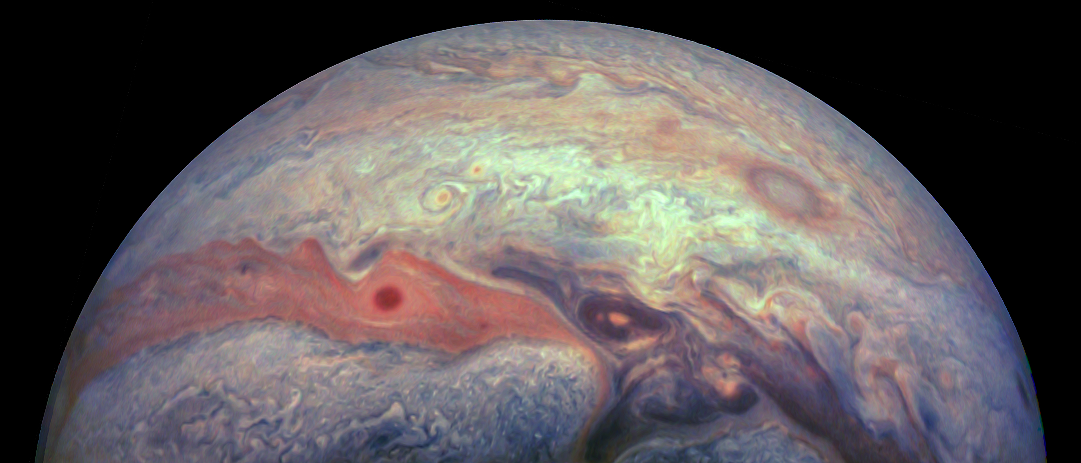 Junocam pixels are 12 bits deep from the camera but are converted to 8 bits inside the instrument using a lossless "companding" table, a process similar to gamma correction, to reduce their size. All Junocam products on the missionjuno website are in this 8-bit form as received on Earth. Scientific users interested in radiometric analysis should use the "RDR" data products archived with the Planetary Data System, which have been converted back to a linear 12-bit scale.