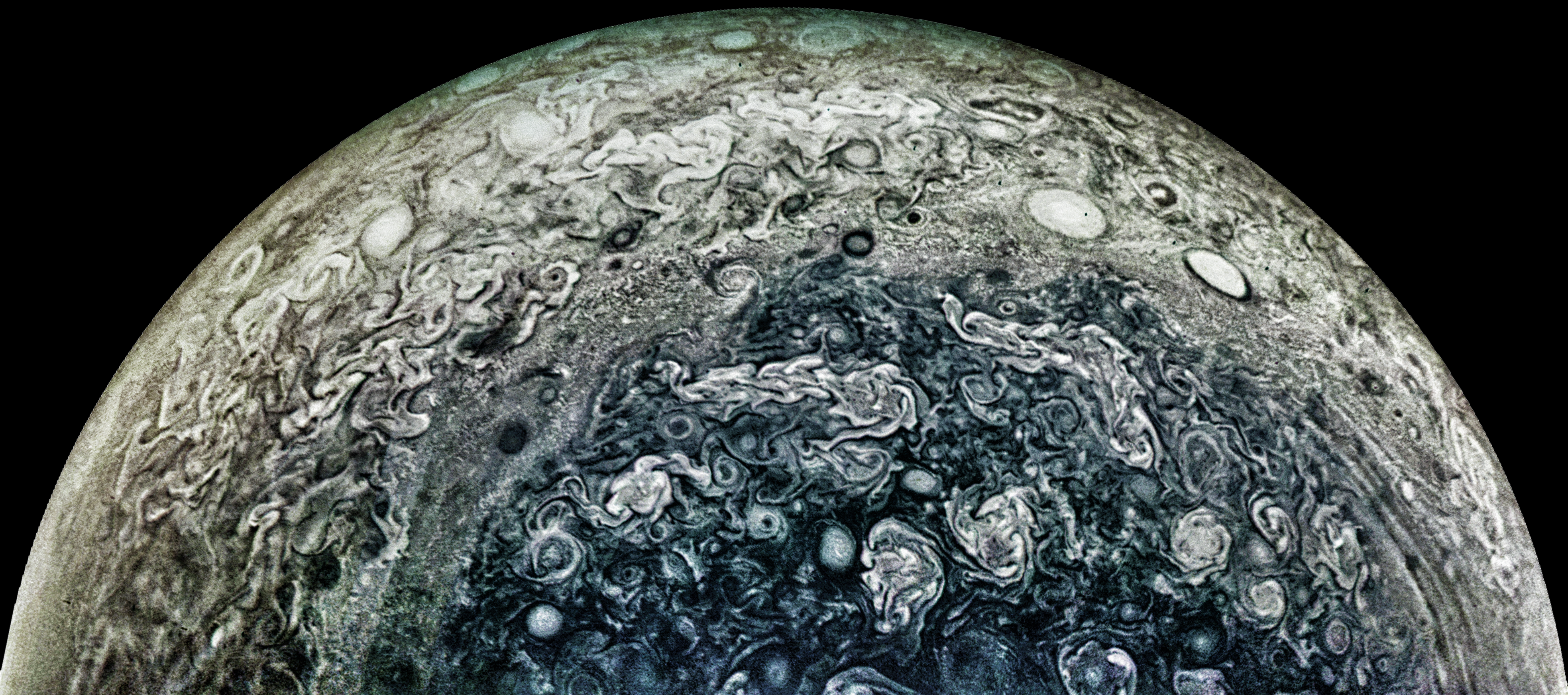 Junocam pixels are 12 bits deep from the camera but are converted to 8 bits inside the instrument using a lossless "companding" table, a process similar to gamma correction, to reduce their size. All Junocam products on the missionjuno website are in this 8-bit form as received on Earth. Scientific users interested in radiometric analysis should use the "RDR" data products archived with the Planetary Data System, which have been converted back to a linear 12-bit scale.