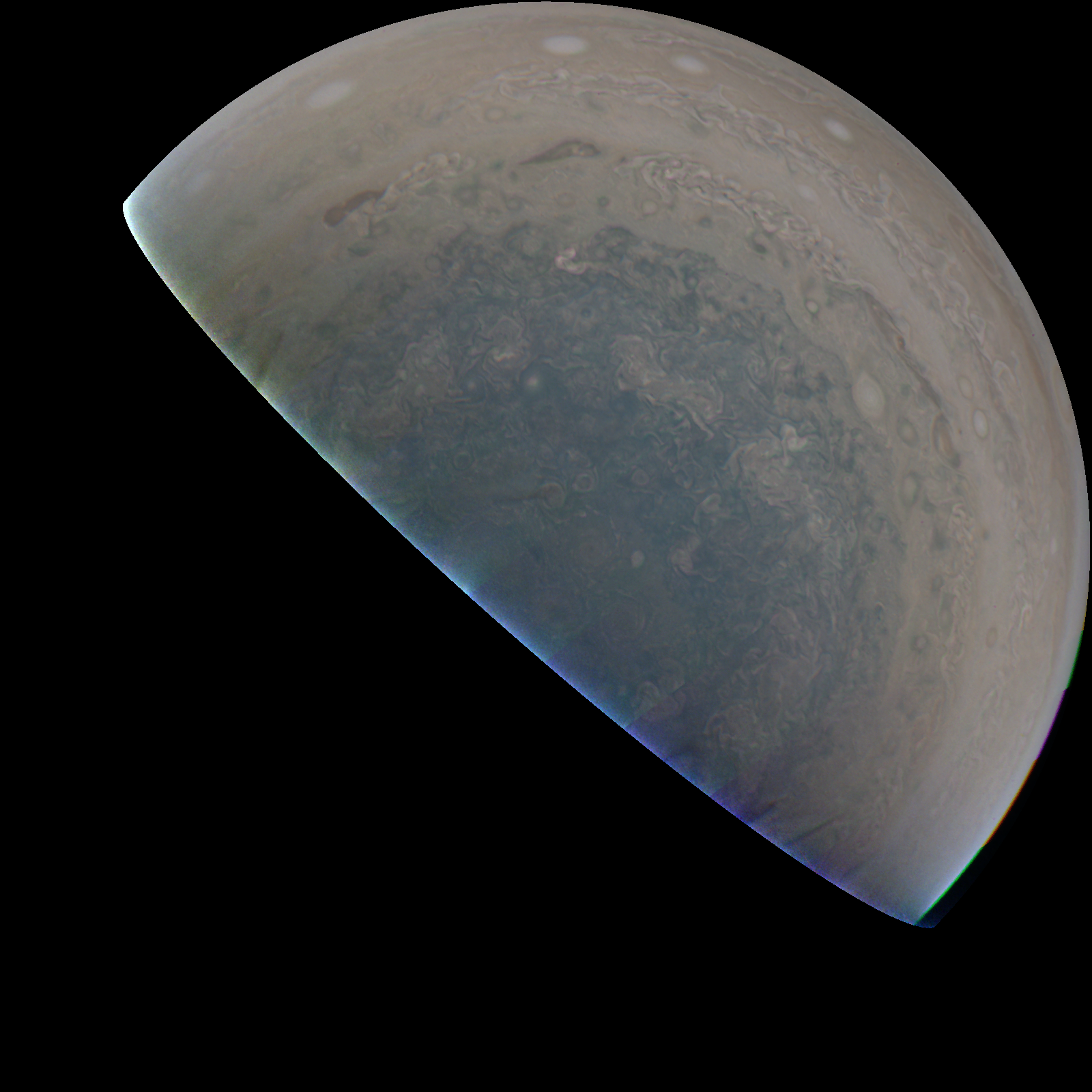 Junocam pixels are 12 bits deep from the camera but are converted to 8 bits inside the instrument using a lossless "companding" table, a process similar to gamma correction, to reduce their size. All Junocam products on the missionjuno website are in this 8-bit form as received on Earth. Scientific users interested in radiometric analysis should use the "RDR" data products archived with the Planetary Data System, which have been converted back to a linear 12-bit scale.
