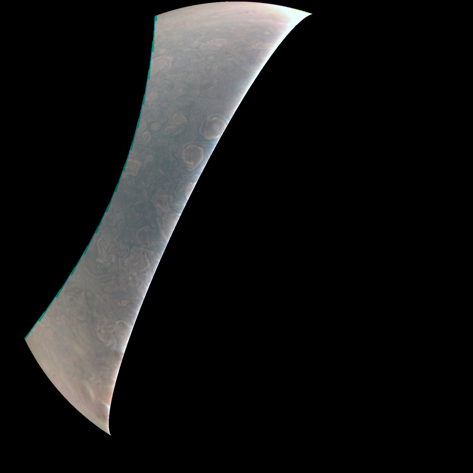 Junocam pixels are 12 bits deep from the camera but are converted to 8 bits inside the instrument using a lossless "companding" table, a process similar to gamma correction, to reduce their size. All Junocam products on the missionjuno website are in this 8-bit form as received on Earth. Scientific users interested in radiometric analysis should use the "RDR" data products archived with the Planetary Data System, which have been converted back to a linear 12-bit scale.