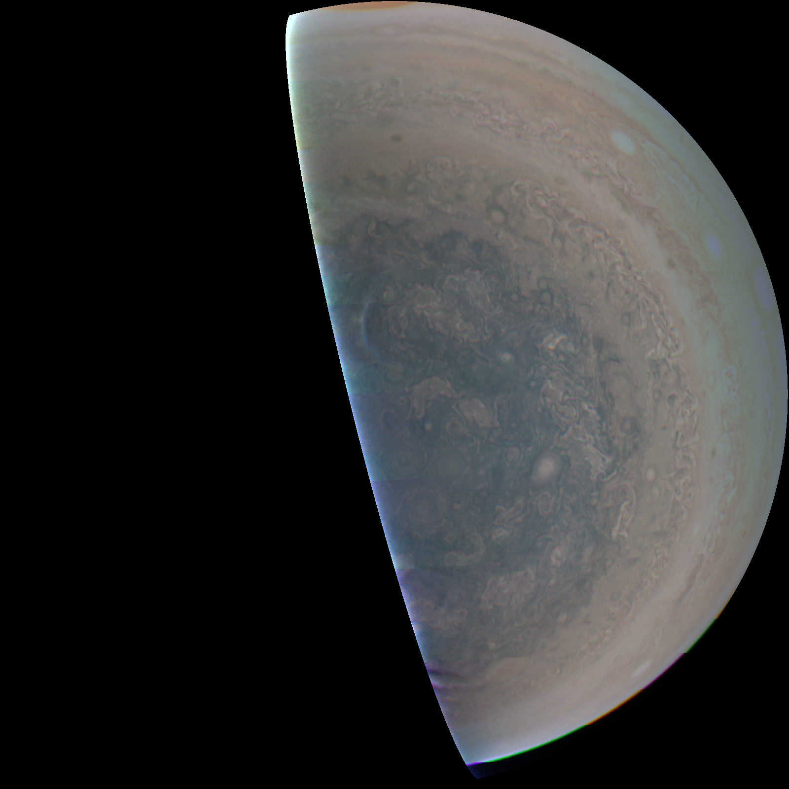 Junocam pixels are 12 bits deep from the camera but are converted to 8 bits inside the instrument using a lossless "companding" table, a process similar to gamma correction, to reduce their size. All Junocam products on the missionjuno website are in this 8-bit form as received on Earth. Scientific users interested in radiometric analysis should use the "RDR" data products archived with the Planetary Data System, which have been converted back to a linear 12-bit scale.