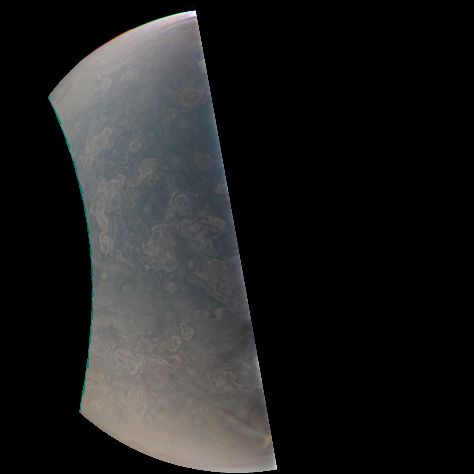 Junocam pixels are 12 bits deep from the camera but are converted to 8 bits inside the instrument using a lossless "companding" table, a process similar to gamma correction, to reduce their size. All Junocam products on the missionjuno website are in this 8-bit form as received on Earth. Scientific users interested in radiometric analysis should use the "RDR" data products archived with the Planetary Data System, which have been converted back to a linear 12-bit scale.