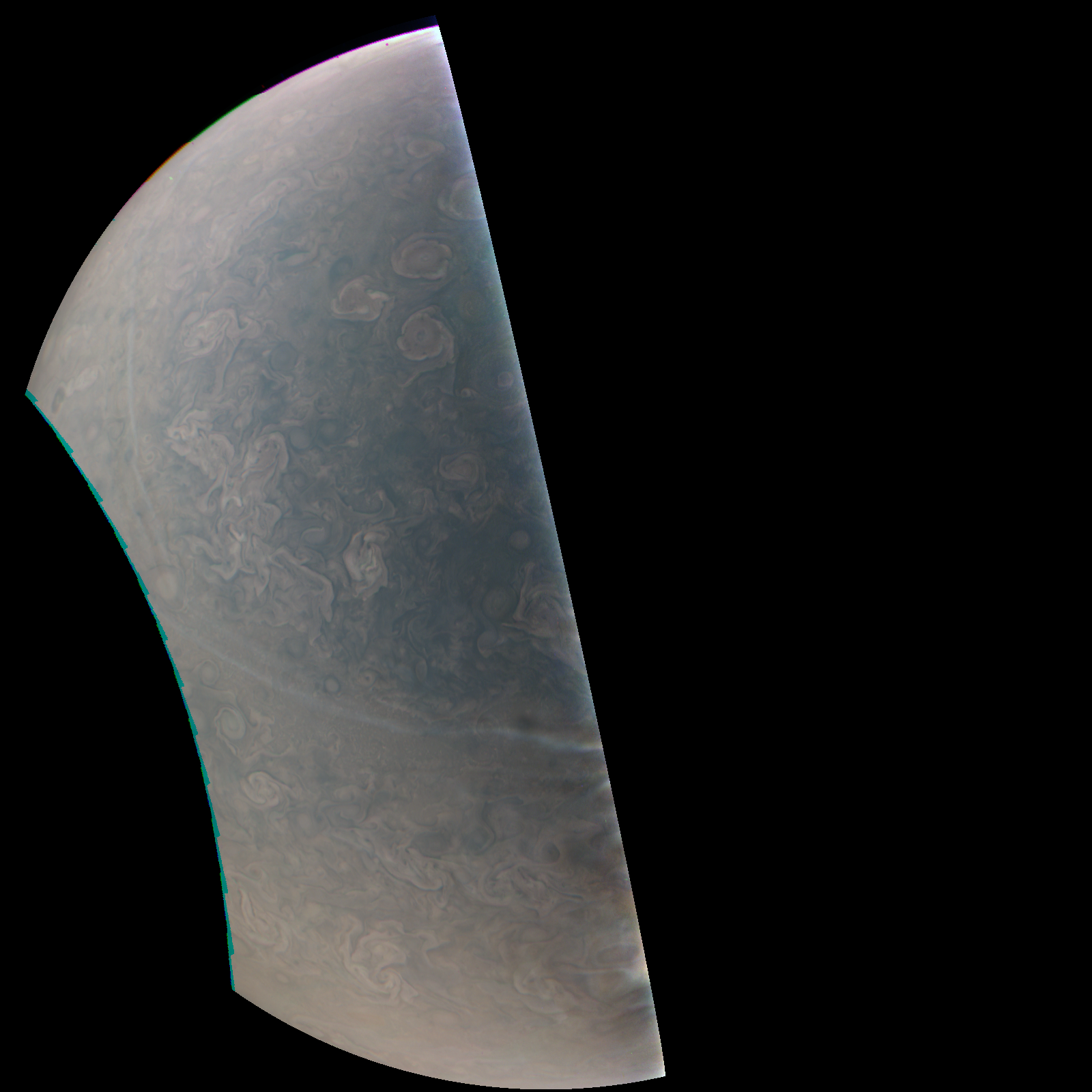 Junocam pixels are 12 bits deep from the camera but are converted to 8 bits inside the instrument using a lossless "companding" table, a process similar to gamma correction, to reduce their size. All Junocam products on the missionjuno website are in this 8-bit form as received on Earth. Scientific users interested in radiometric analysis should use the "RDR" data products archived with the Planetary Data System, which have been converted back to a linear 12-bit scale.