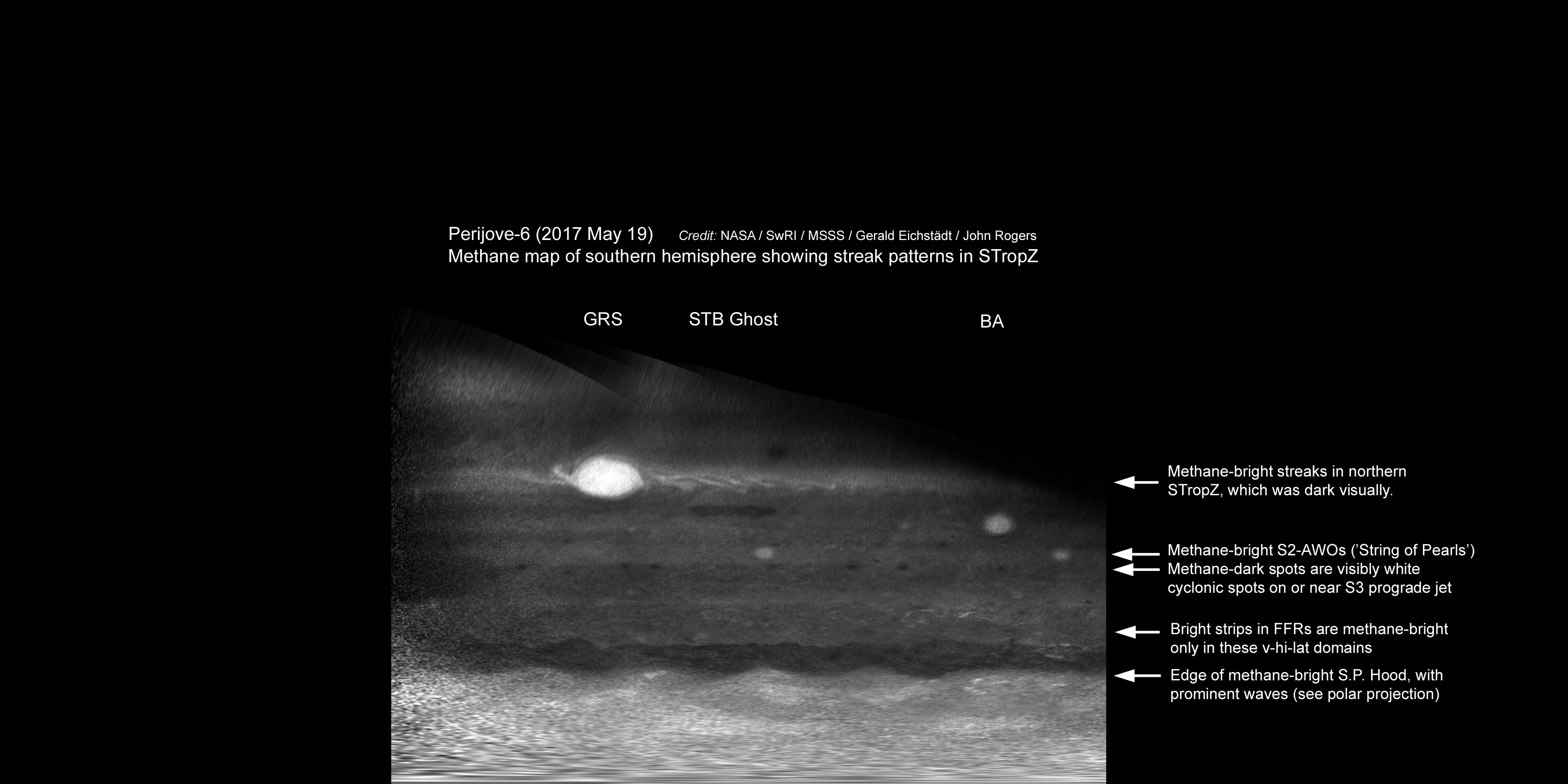 The methane filter is narrow, centered on 889 nm. Features that are bright in methane images are typically found at high altitudes where light is reflected before it is absorbed.