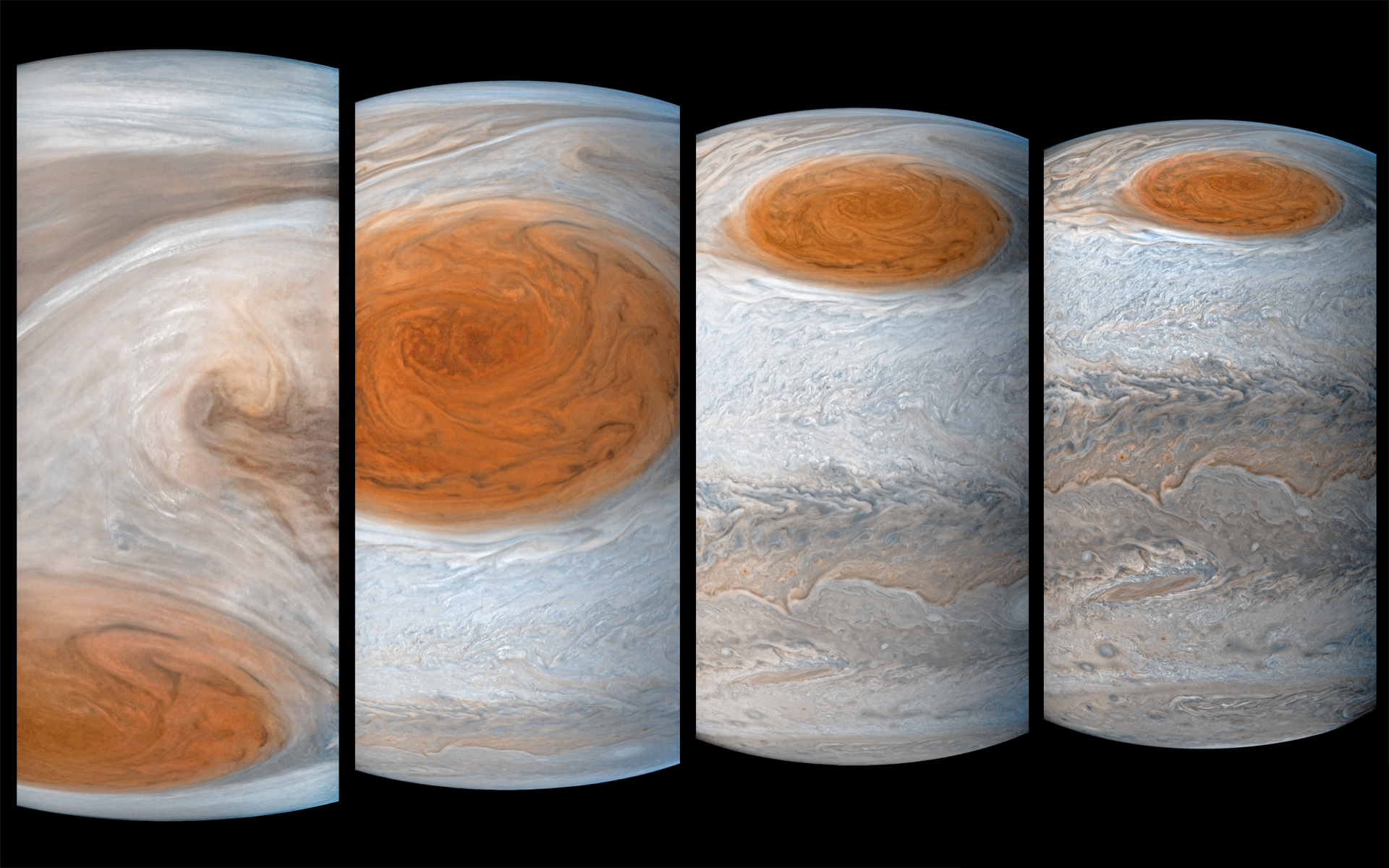 On Perijove 7 Juno made a close pass over the Great Red Spot (GRS). Four images were collected in 10 minutes, with spatial scales from 4 - 11 km/pixel as shown in this collage by Gerald Eichstadt and Justin Cowart..