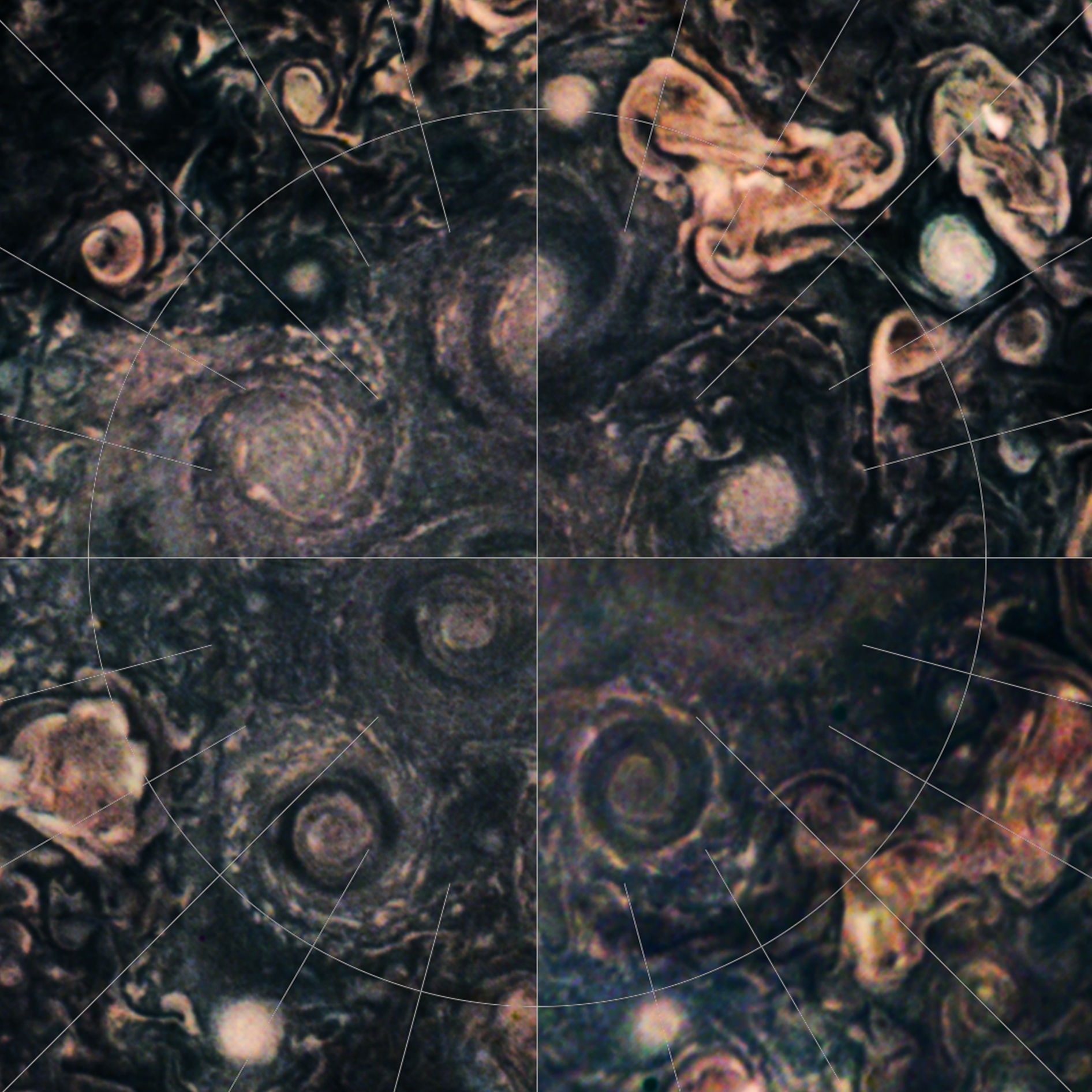 Upper right: A mosaic of Jupiter's north polar region with enhanced colors and contrast.