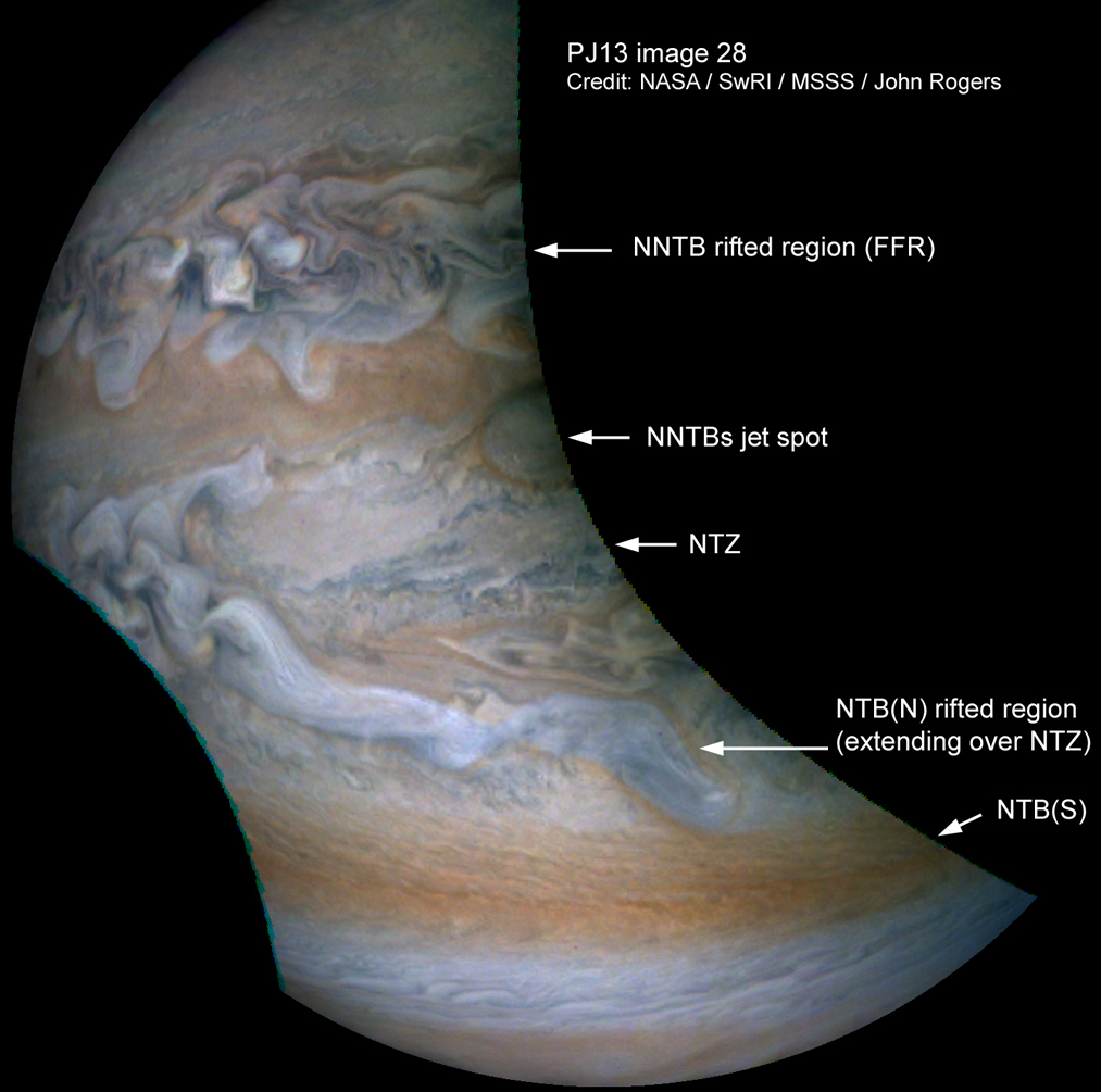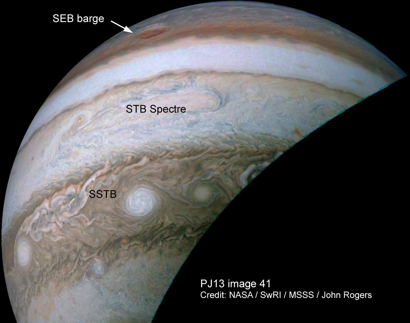 Here are two samples of the PJ13 images, labelled. One shows the impressive rifted regions in the NTB and NNTB; the other is the most complete view yet of the STB Spectre, confirming that is intact despite the turbulence that buffetted it recently. These are from the ‘version 1’ images posted by the JunoCam team; the full-resolution versions posted by Gerald on the JunoCam web site show mind-boggling detail.