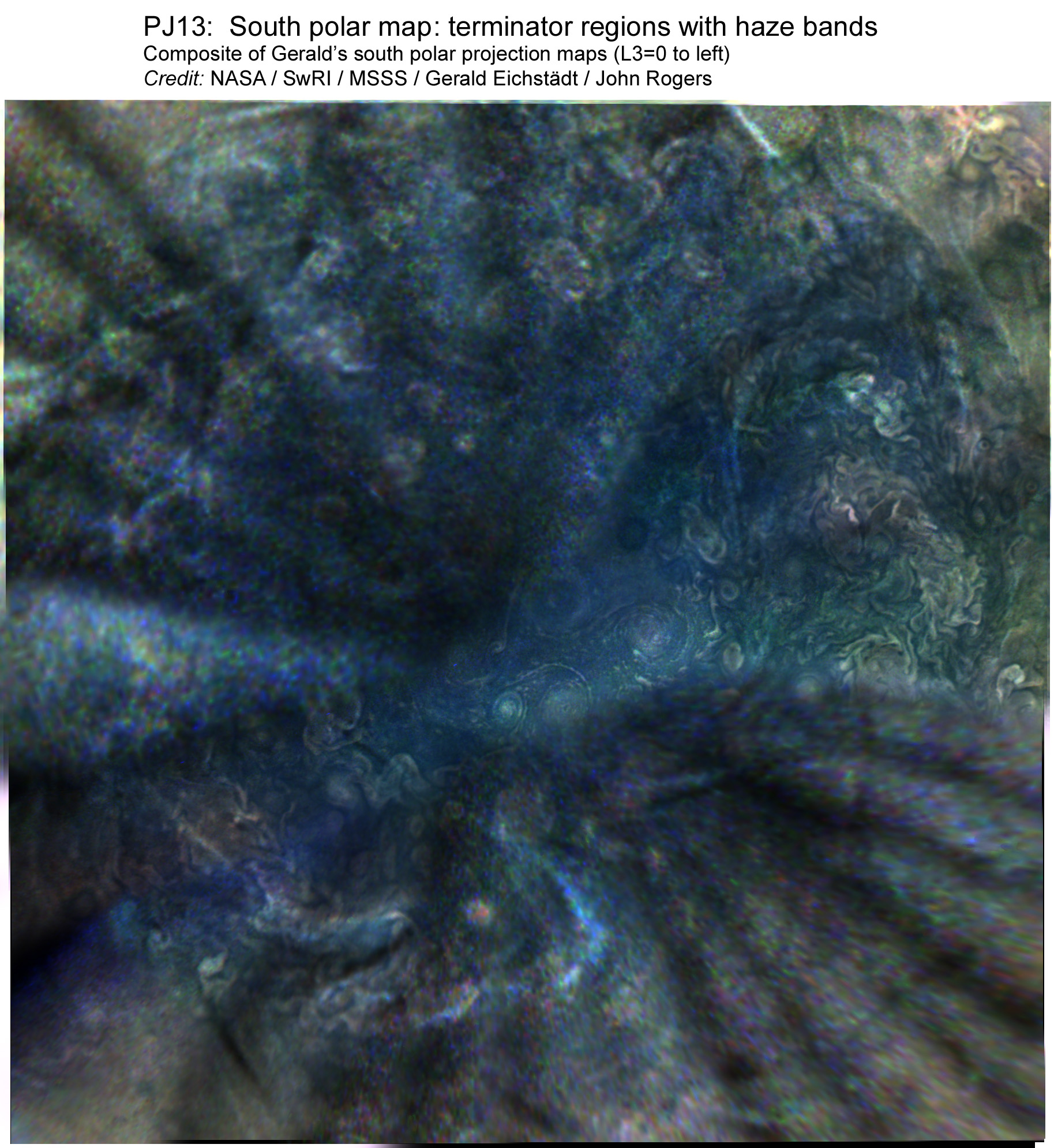 Many minor haze bands are visible, but notably, the ‘Long Band’ is almost entirely absent, for the first time since PJ4. There are some intensely bright and dark arcs of haze, spanning the belt of FFRs at ~67-71ºS, but they are well north of the usual position of the Long Band.