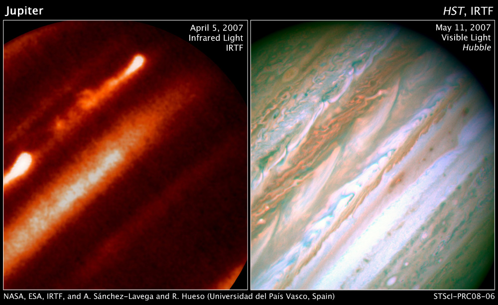 Detailed analysis of two continent-sized storms that erupted in Jupiter's atmosphere in March 2007 shows that Jupiter's internal heat plays a significant role in generating atmospheric disturbances.
