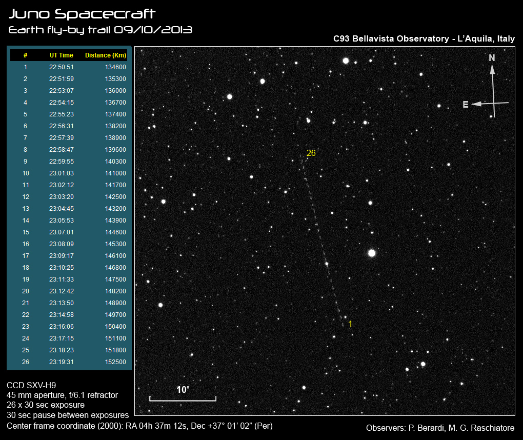 A couple of hours after Juno passed by Earth on Oct. 9, 2013, British observer Nick James used an 11-inch Schmidt-Cassegrain telescope to obtain this sequence of five-second exposures, showing the spacecraft moving against the background stars.