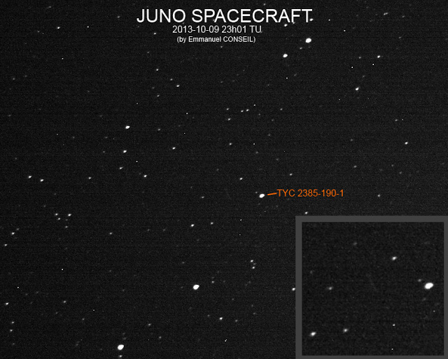 Three and a half hours after Juno passed by Earth on Oct. 9, 2013, French observer Emmanuel Conseil captured a faint image of the spacecraft. Juno appears as a faint streak here, to the left of the bright star labeled "TYC 2385-695-1," which is in the constellation Perseus. Conseil imaged the spacecraft at a time when its