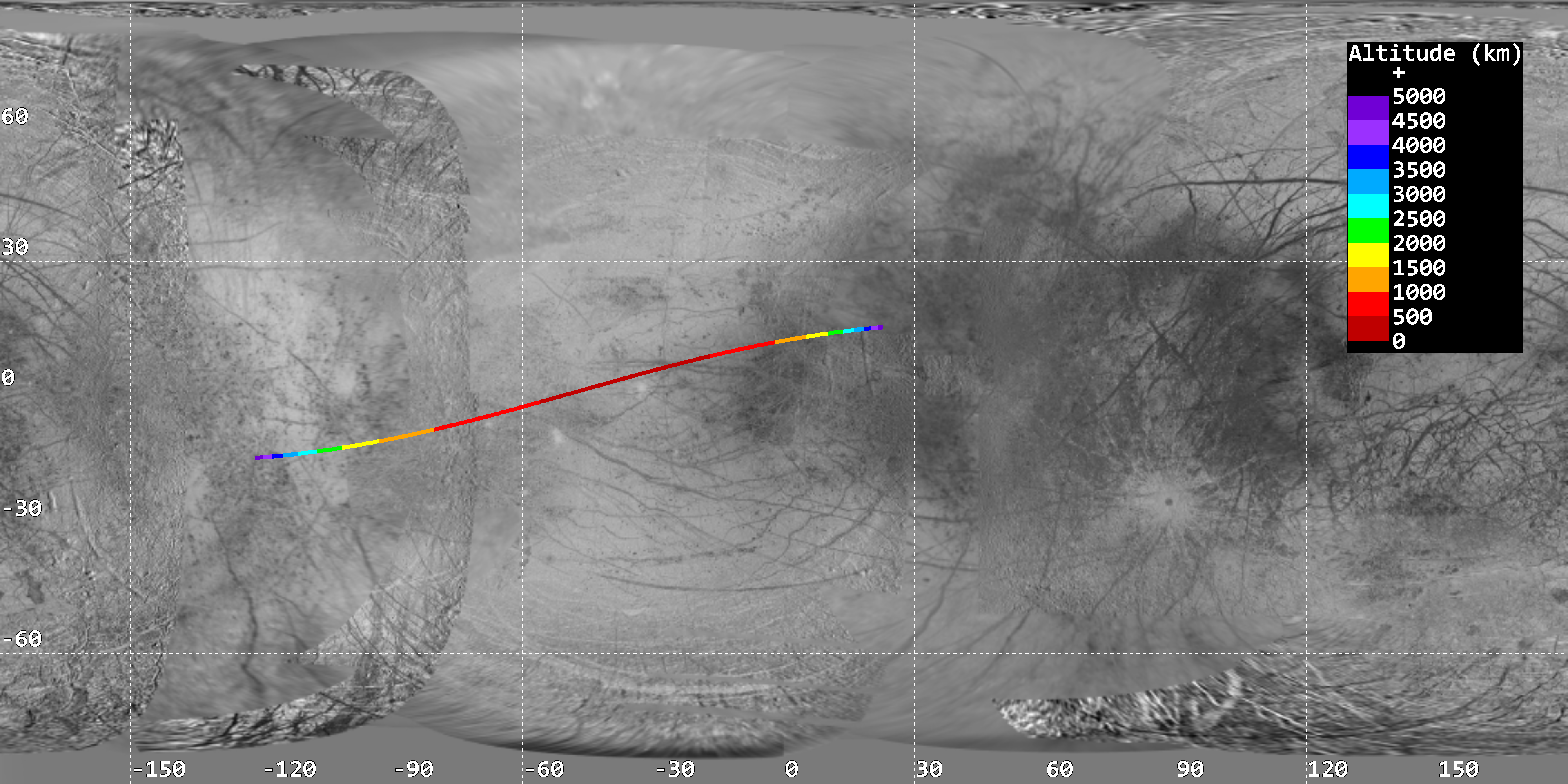 This figure provides a trace of the ground track as Juno flew past Europa on September 29, 2022, prior to the 45th perijove. The track is colored as a function of altitude from the moon’s surface, see the legend, with a minimum flyby altitude of 354 km. West longitude increases to the left of the prime meridian (in the center of the figure).